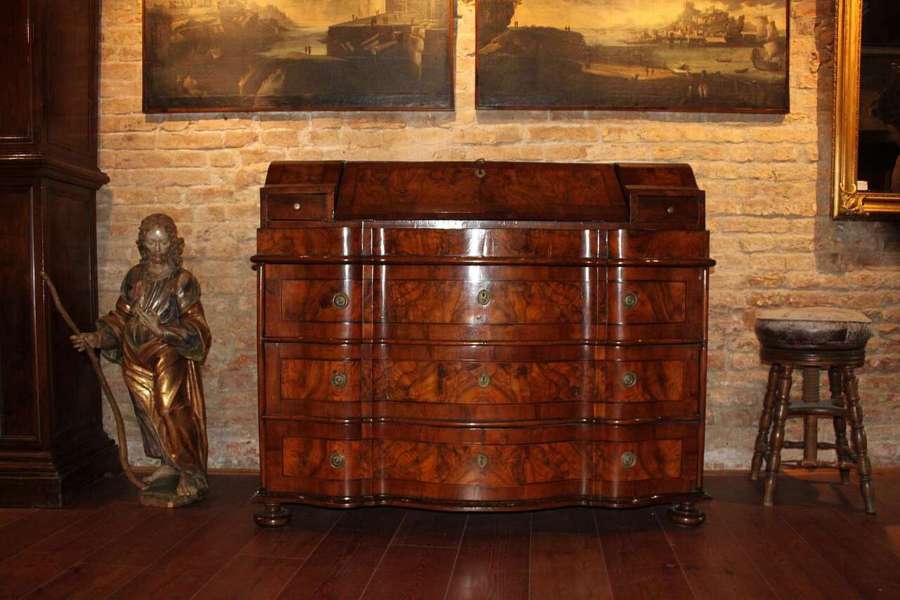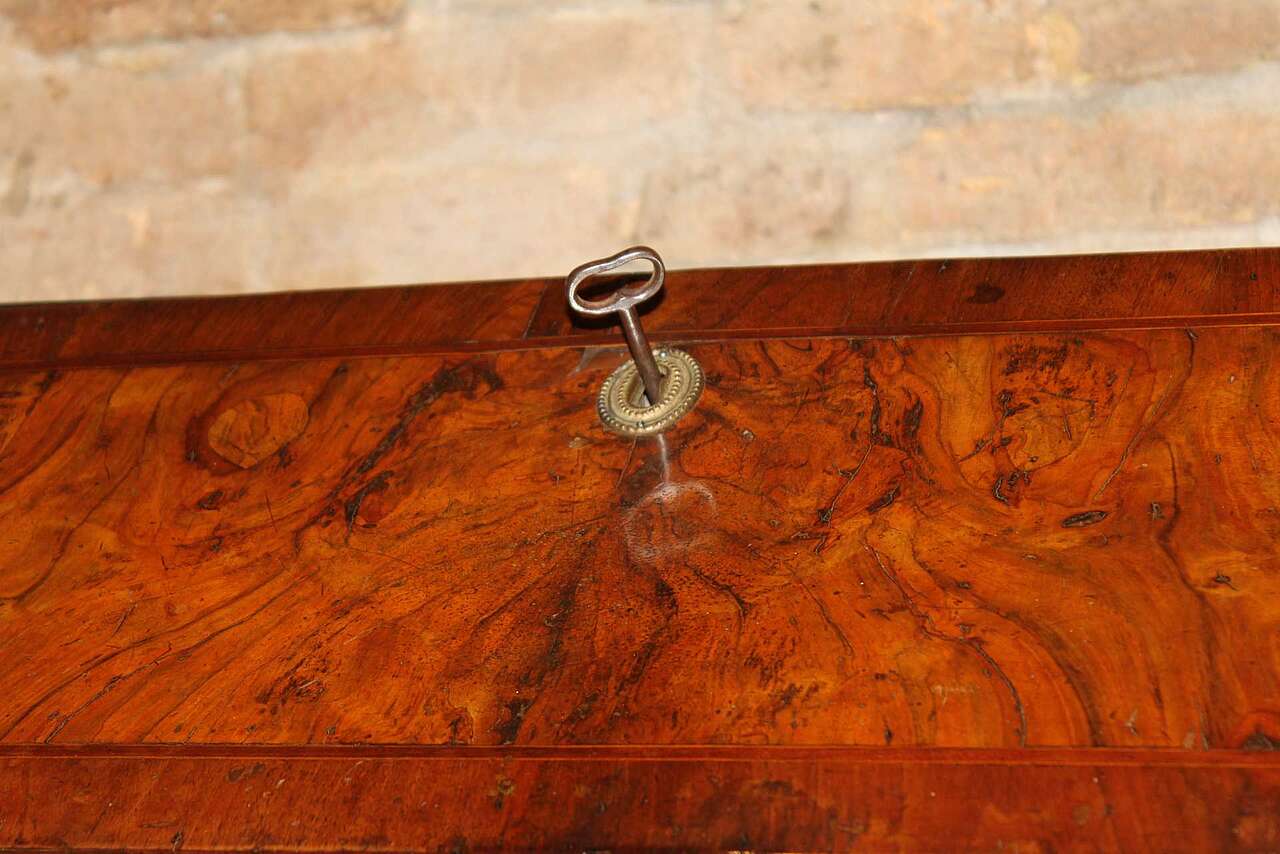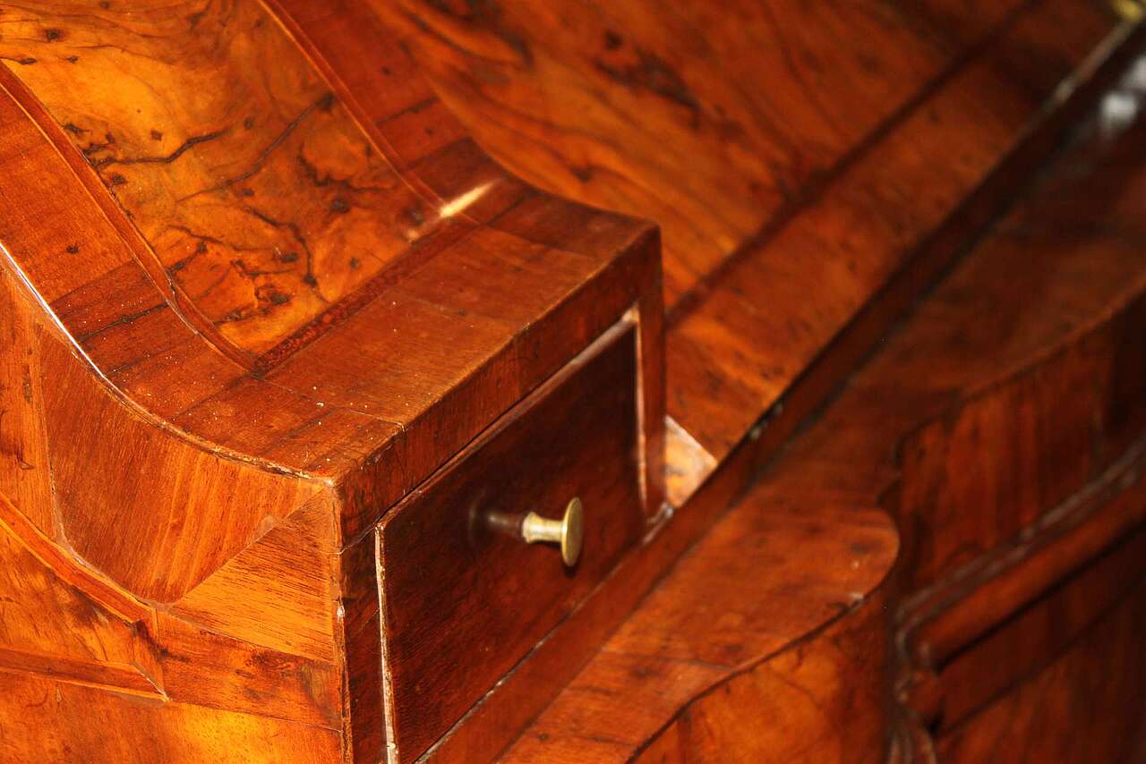 Cassettone a ribalta, veronese, characterized by the presence of the so-called "shoulders", described by the modulation of the upper segment of the side uprights, which frame the plane calatoio favoring the inclination. The dazzling pictorialism is the result of the wise use of walnut root. The front is shaped like a crossbow, while the sides are straight. Verona, mid 18th century.