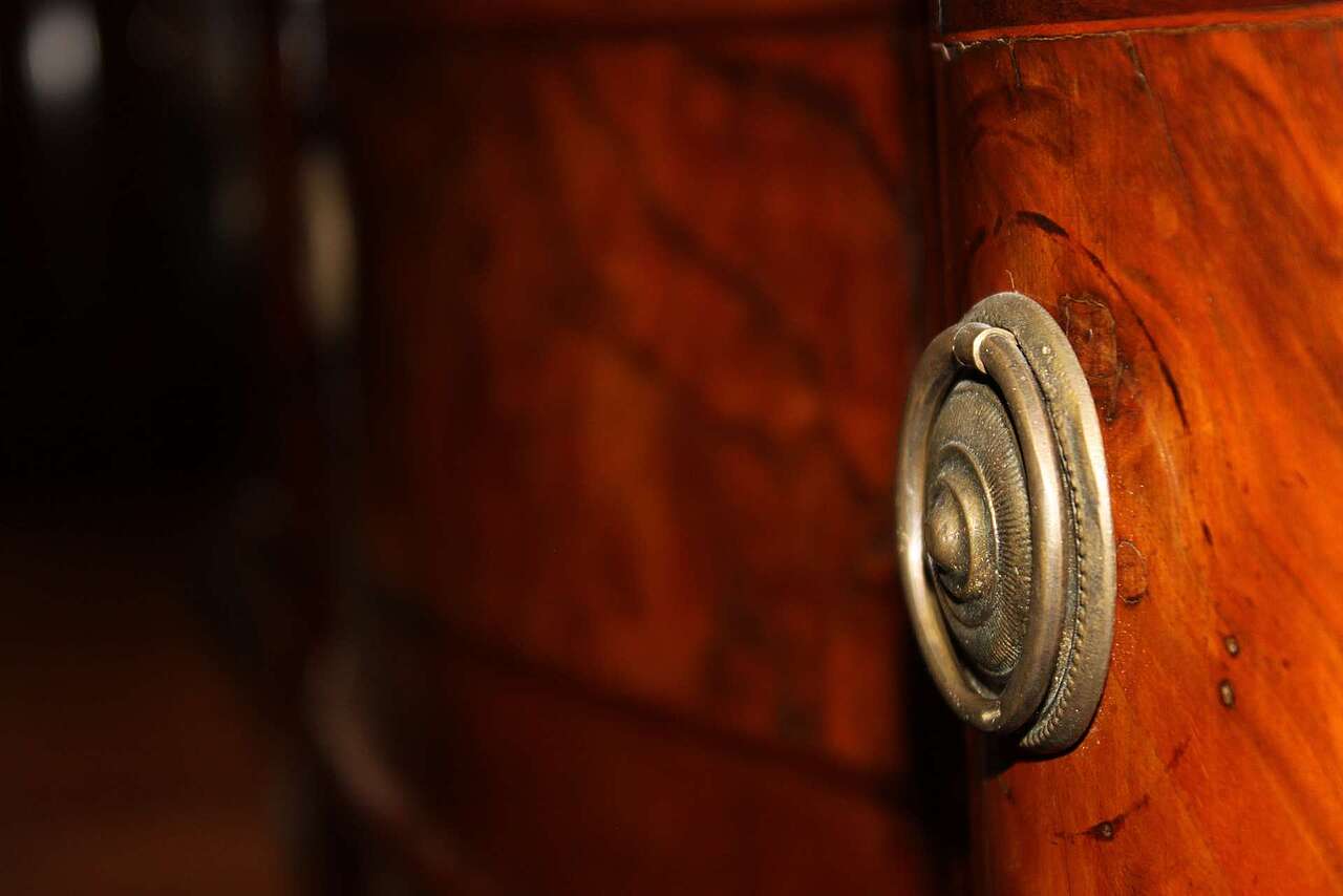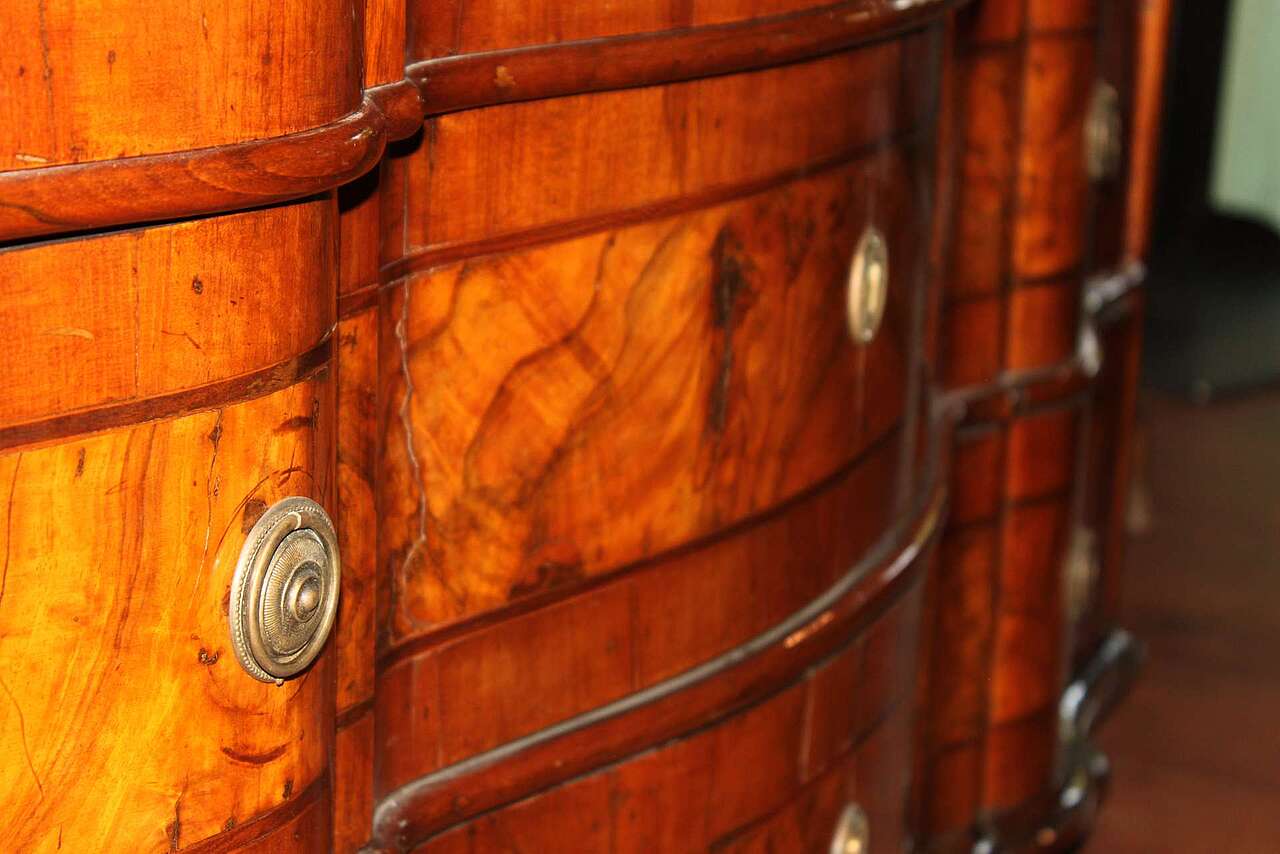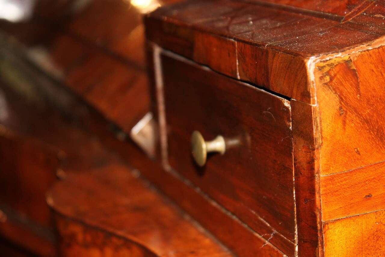 Cassettone a ribalta, veronese, characterized by the presence of the so-called "shoulders", described by the modulation of the upper segment of the side uprights, which frame the plane calatoio favoring the inclination. The dazzling pictorialism is the result of the wise use of walnut root. The front is shaped like a crossbow, while the sides are straight. Verona, mid 18th century.
