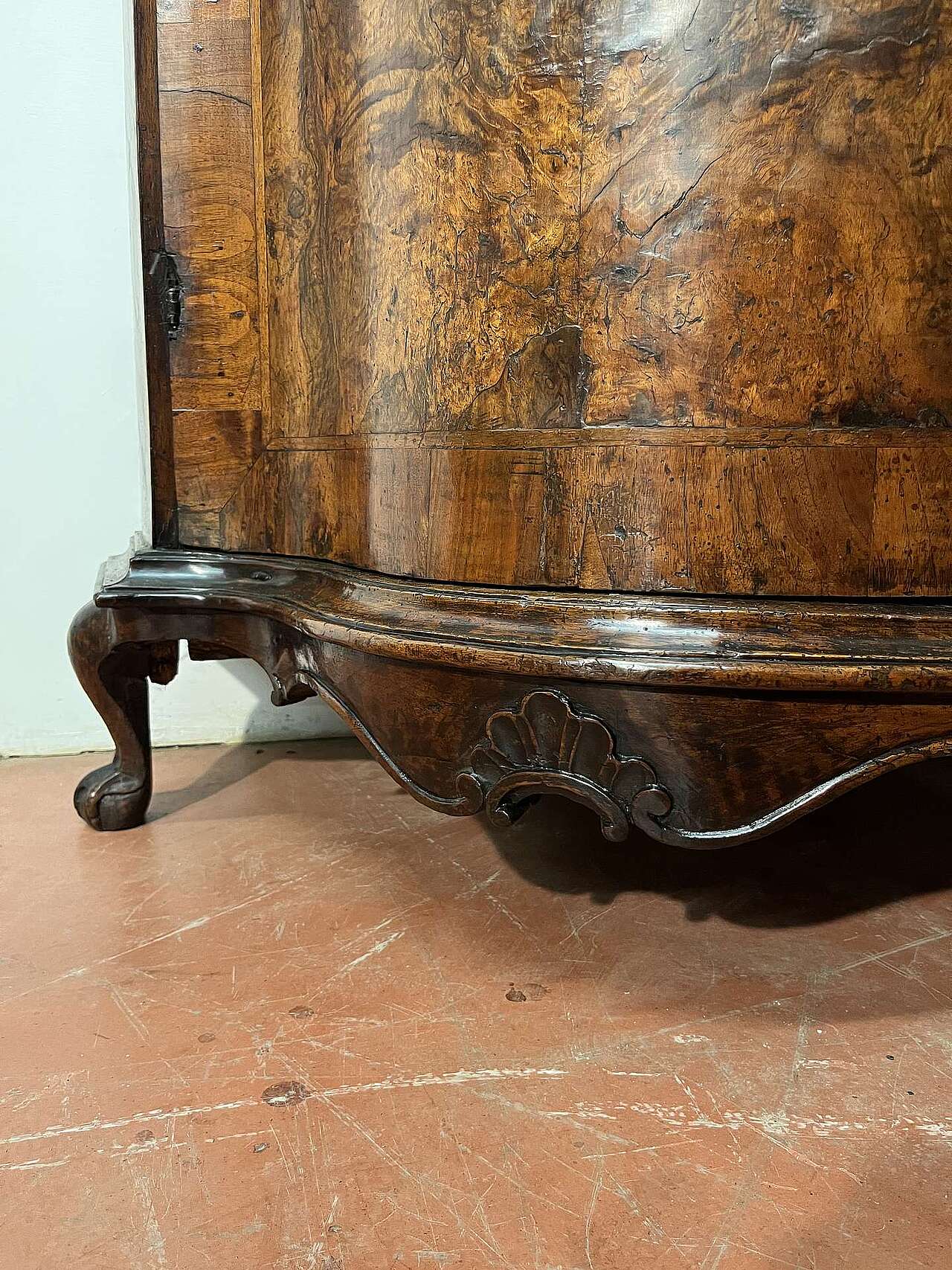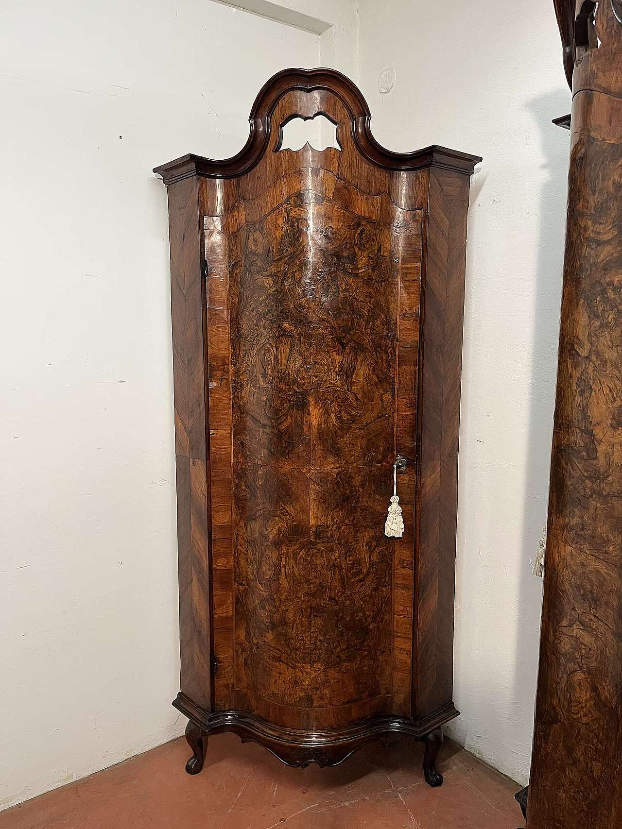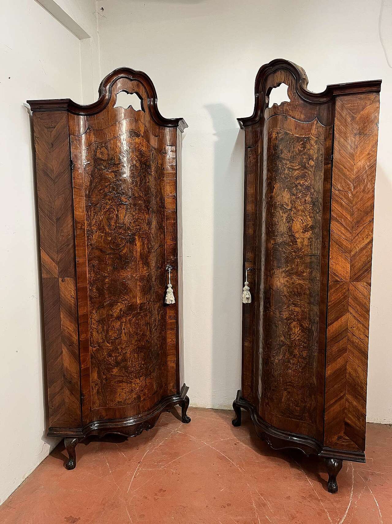 Rara coppia di Cantonali Veneziani Luigi XV, interamente in noce e radica di noce, mossi sul fronte.