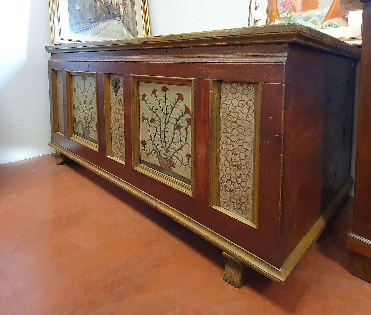 Cassa in legno di abete finemente dipinta con motivi vegetali.
