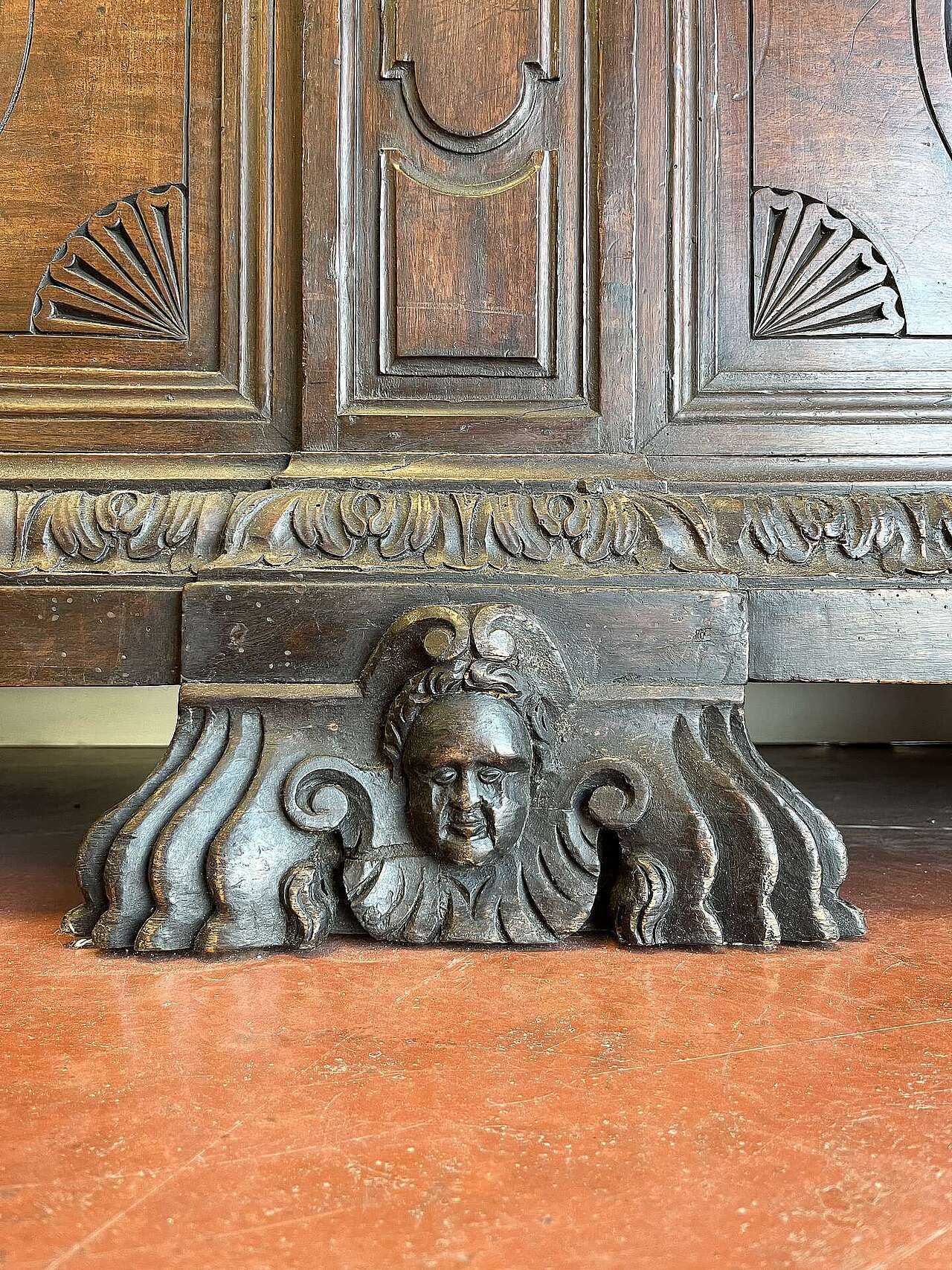 Cassapanca di fine '500 in noce, intagliata, veneta