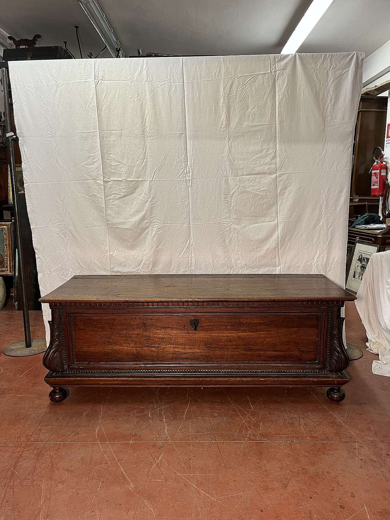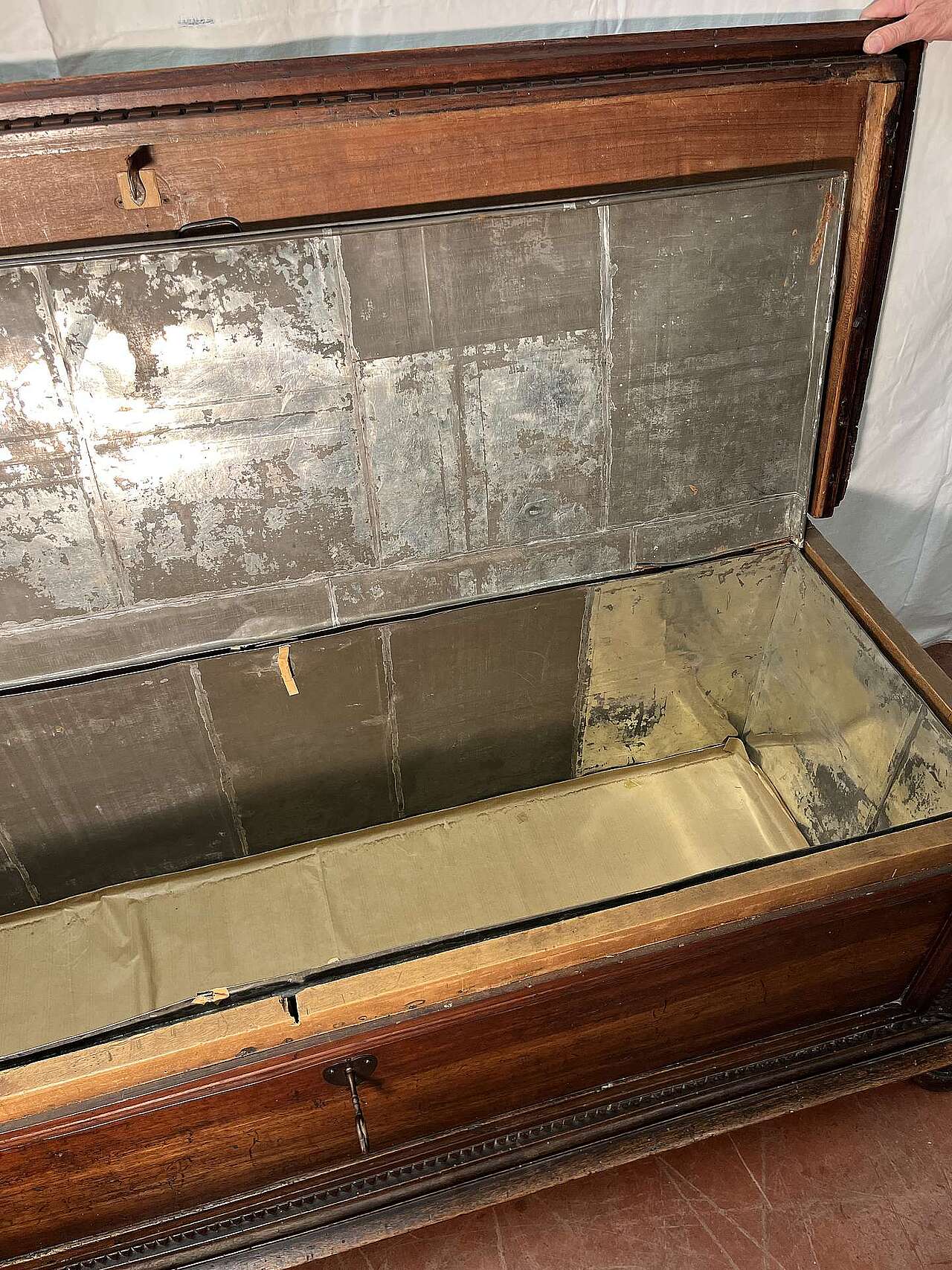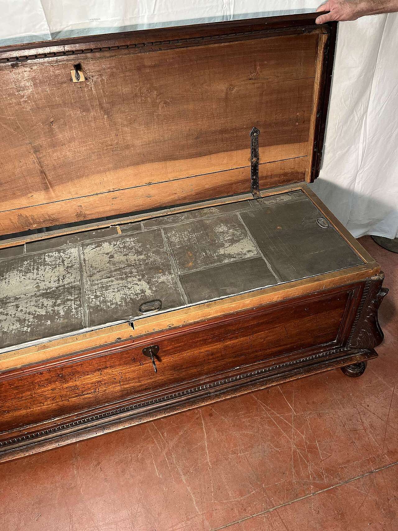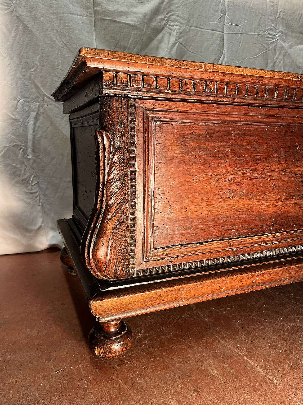 Cassapanca del '600 in noce finemente intagliata, negli angoli con foglie d'acero. Con all'interno contenitore in metallo piombato per contenere meglio la dote. Un riguardo per la chiave!