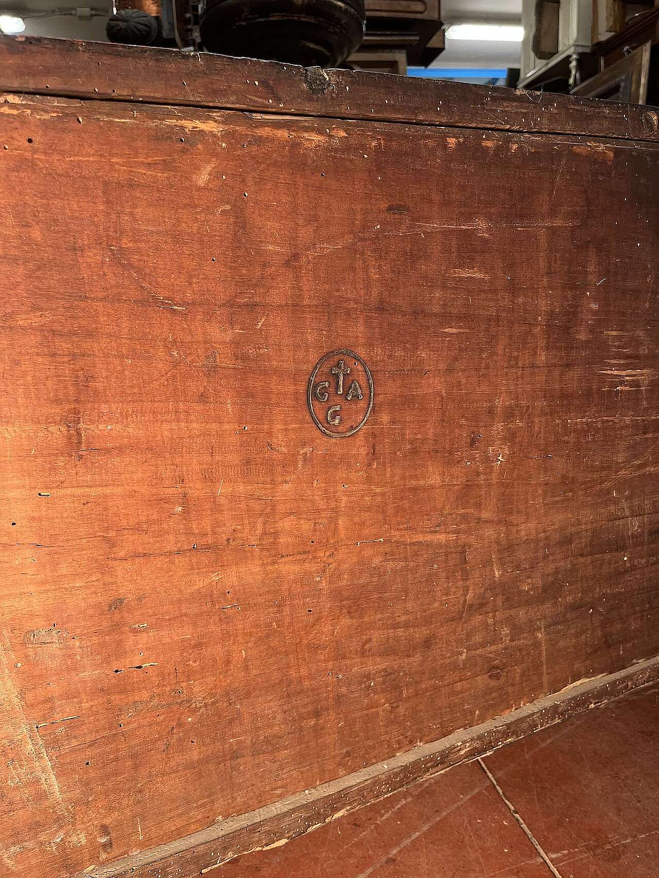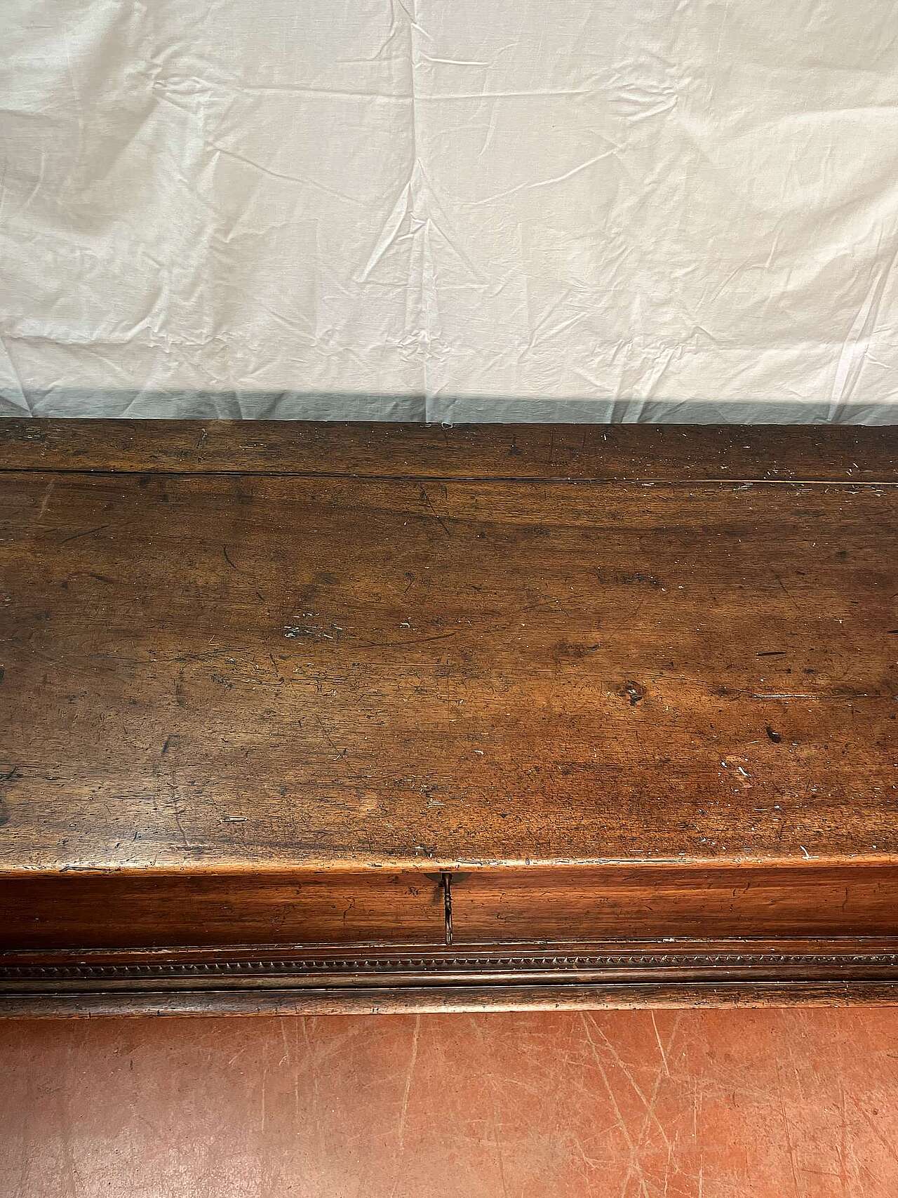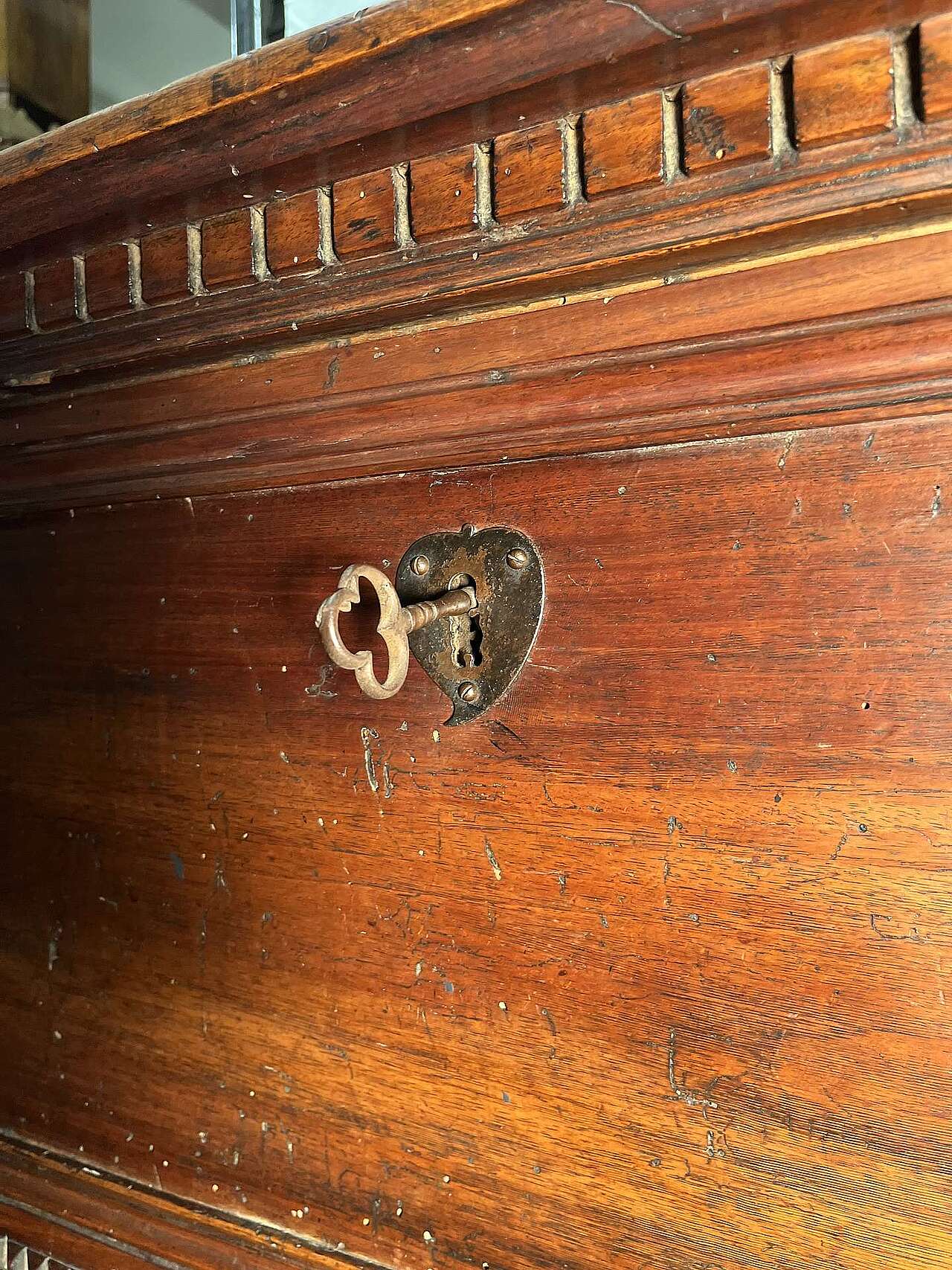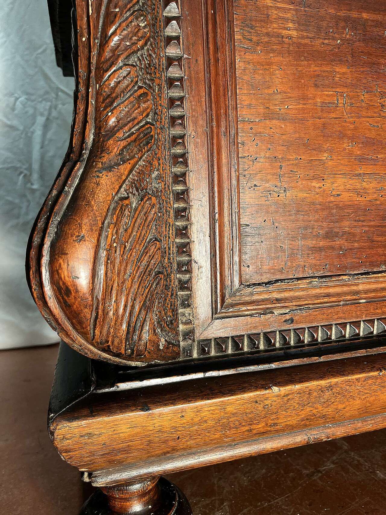 Cassapanca del '600 in noce finemente intagliata, negli angoli con foglie d'acero. Con all'interno contenitore in metallo piombato per contenere meglio la dote. Un riguardo per la chiave!