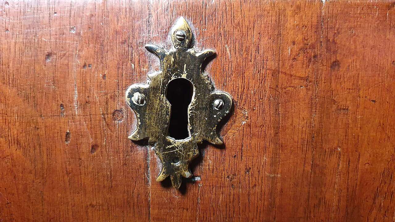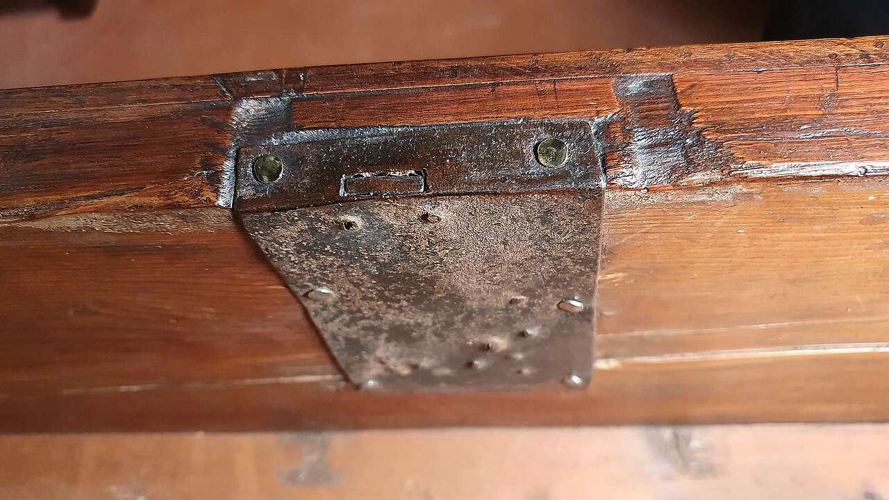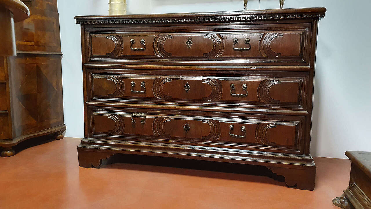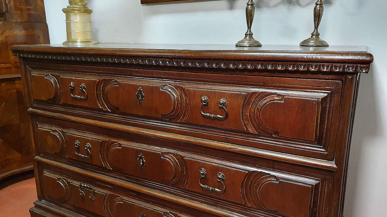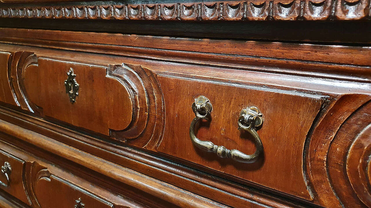 Il mobile è in legno di noce e alcune parti, come la decorazione presente lungo il fronte dei cassetti, sono lastronate in legno di noce e radica di noce.