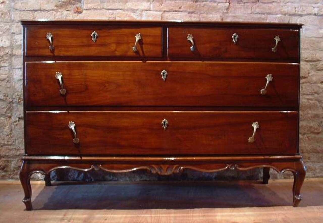 Cassettone in legno di ciliegio, due cassetti grandi e due piccoli. La struttura del mobile è molto semplice e tutta la decorazione è concentrata lungo il grembiule che con i motivi a volute impreziosisce la parte bassa fino a congiungere le belle gambe "a esse". Il mobile è integro in tutte le sue parti.