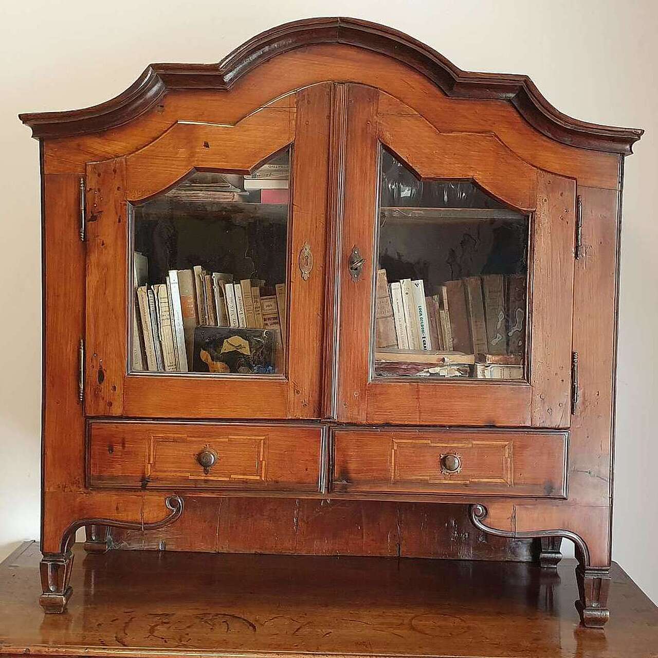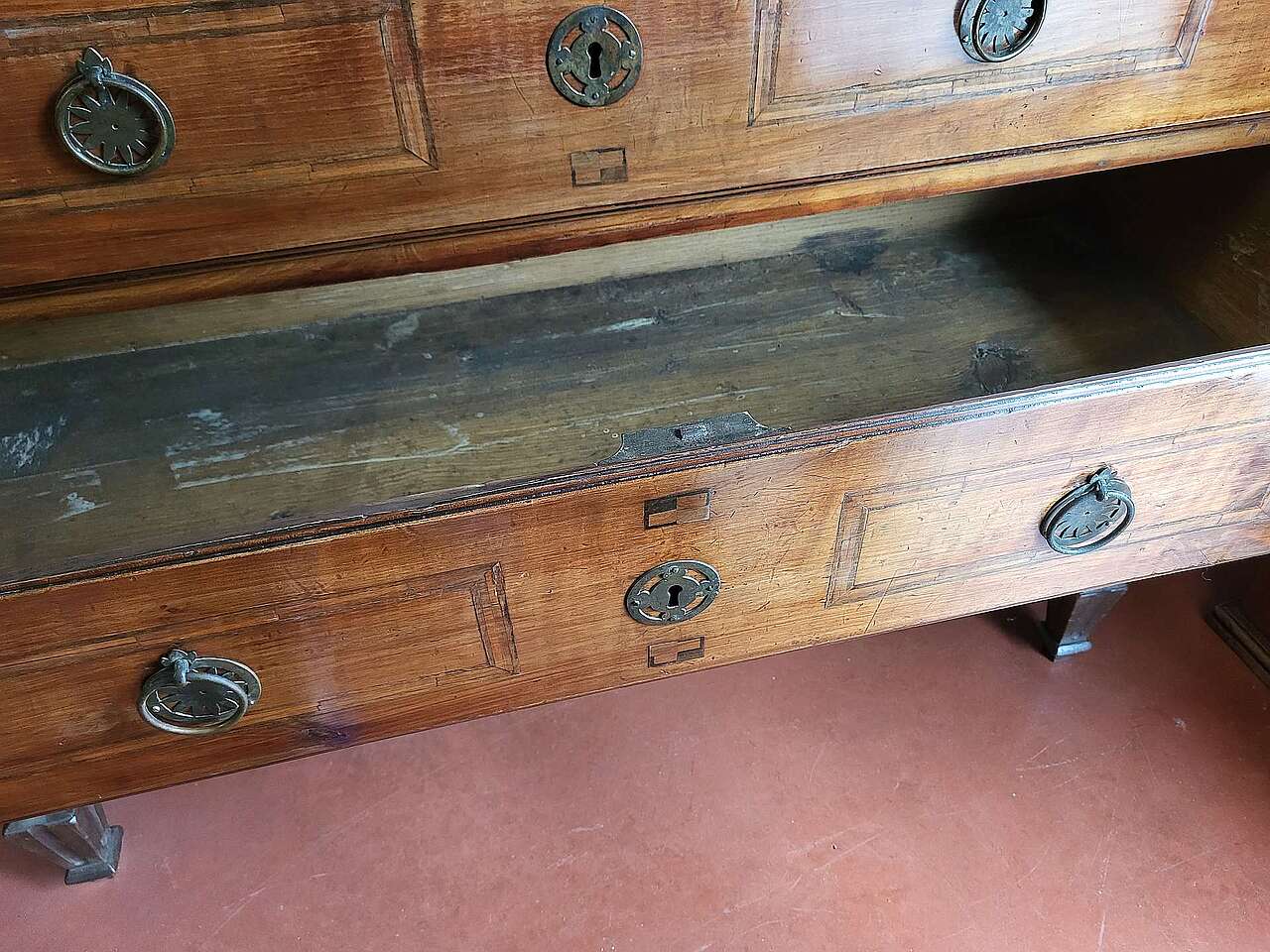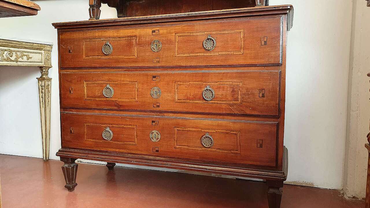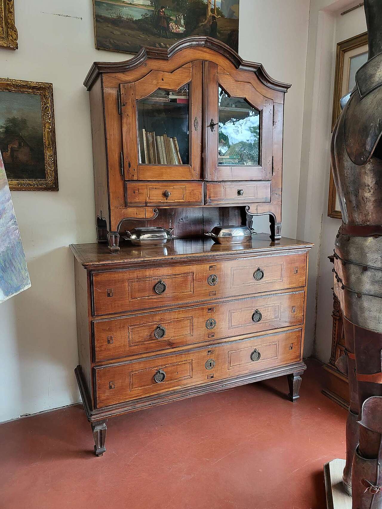 Comò con alzata trentino in ciliegio, filettato su fronte e fianchi e con segreto.