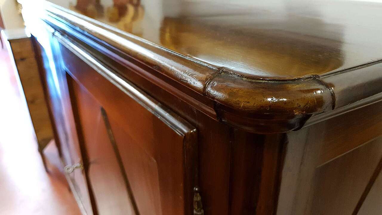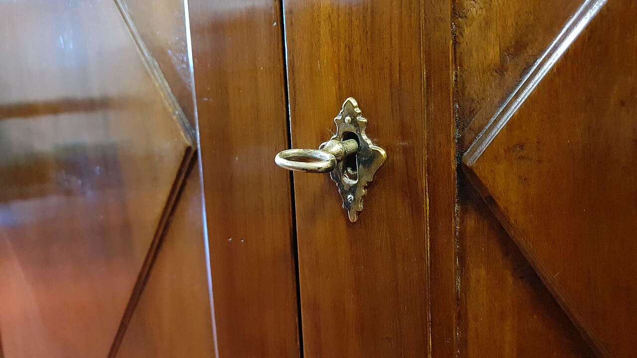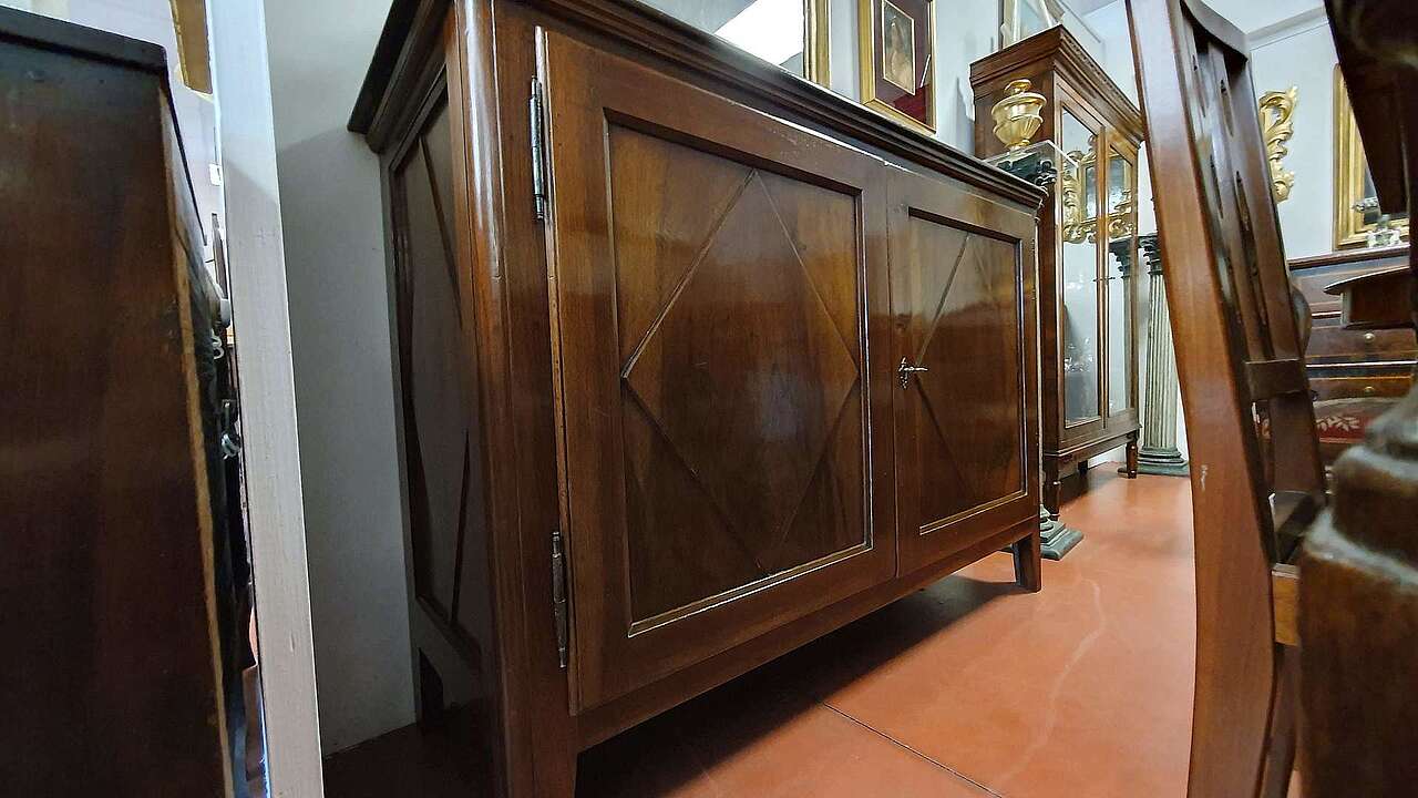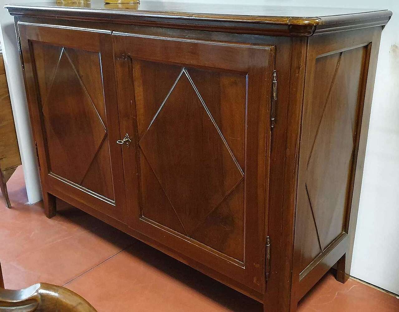 Credenza in legno di noce, a due ante decorate con grandi losanghe.