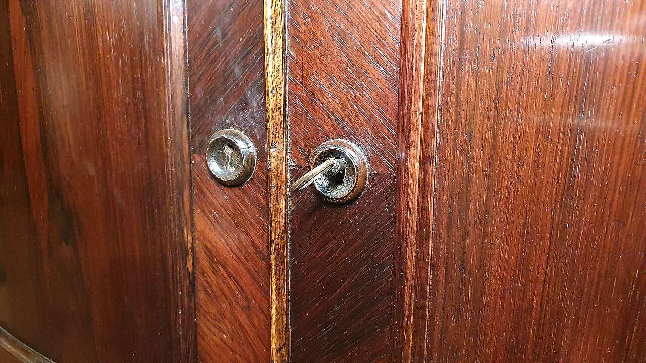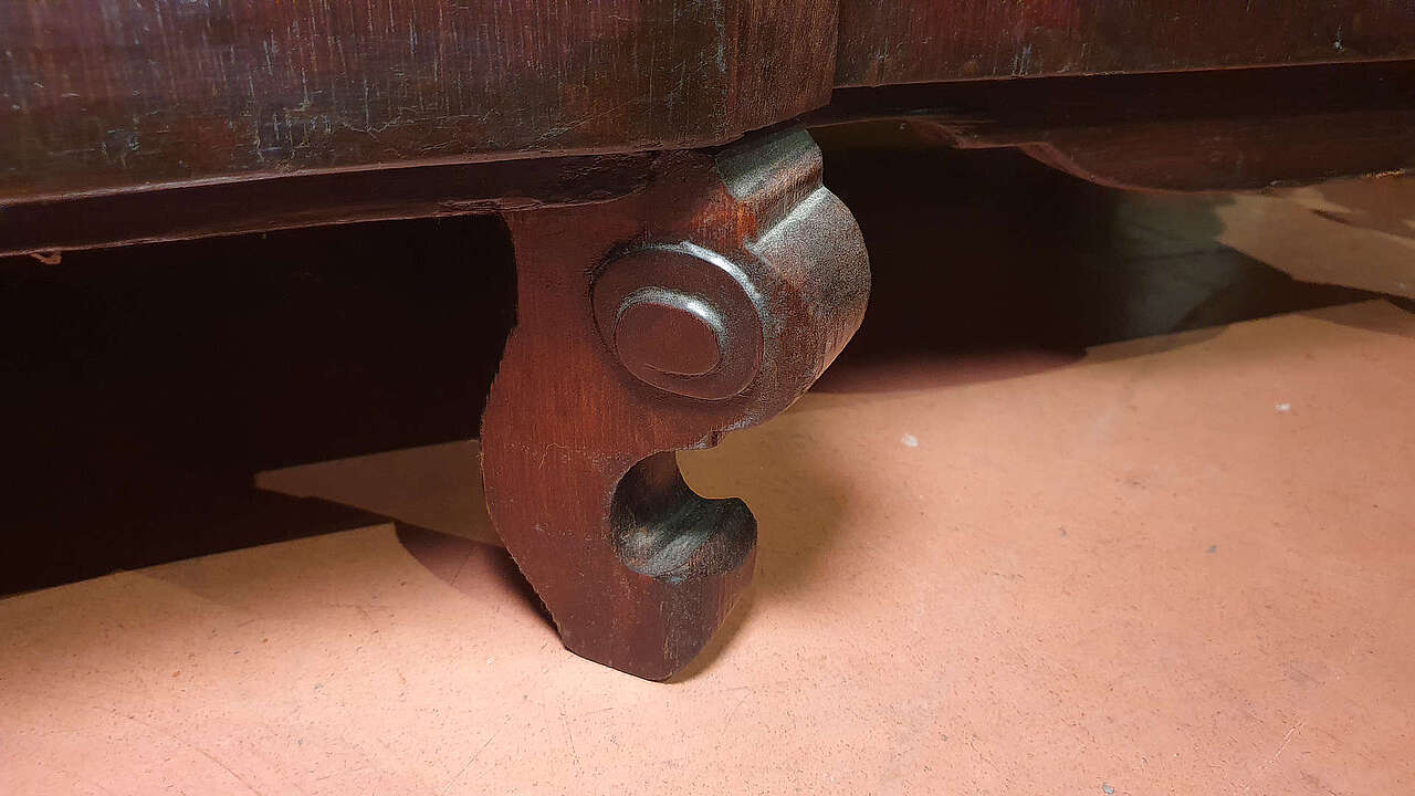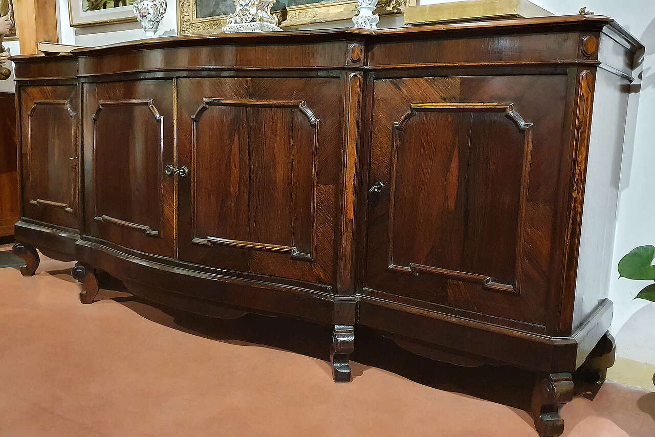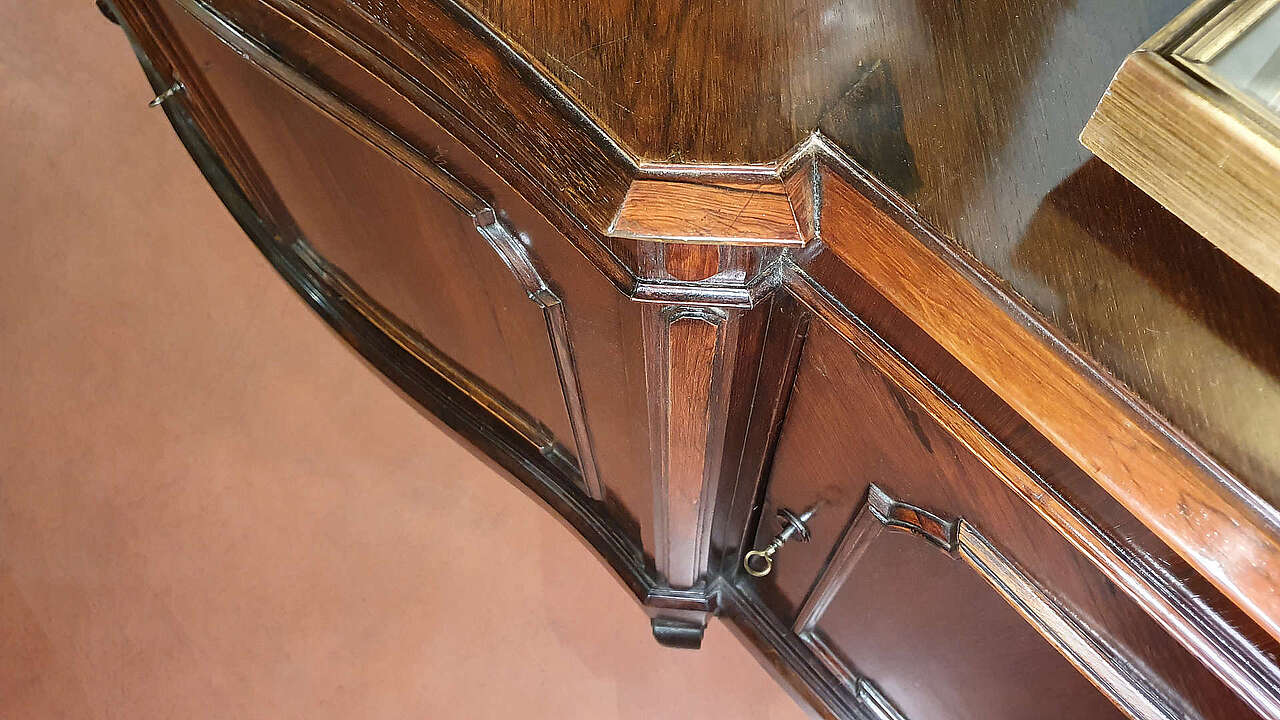 Credenza di importanti dimensioni e di particolare decorazione, in legno di palissandro. Era parte dell'arredo originale dell' osteria "alla Colonna", tipico locale trevigiano.