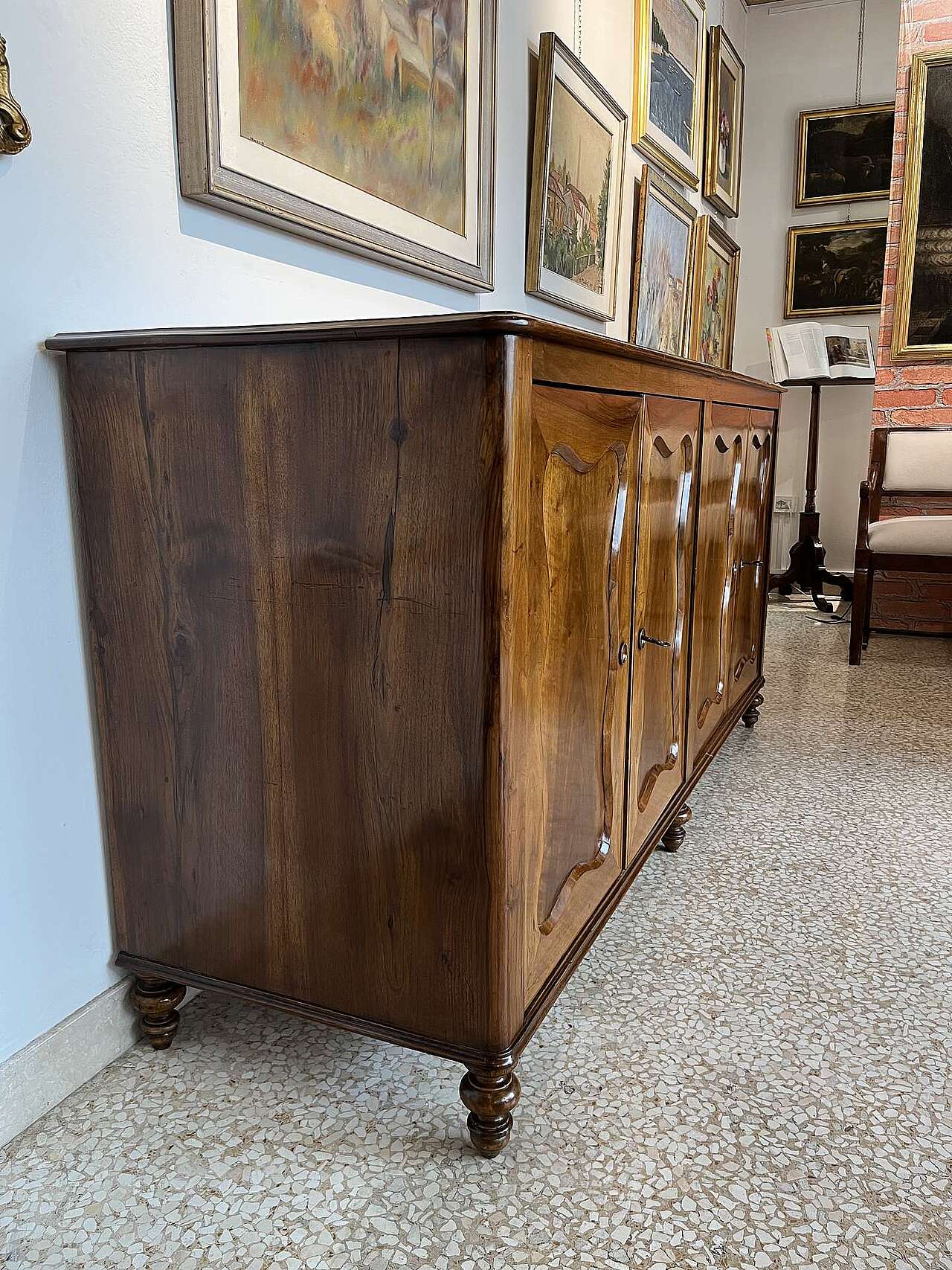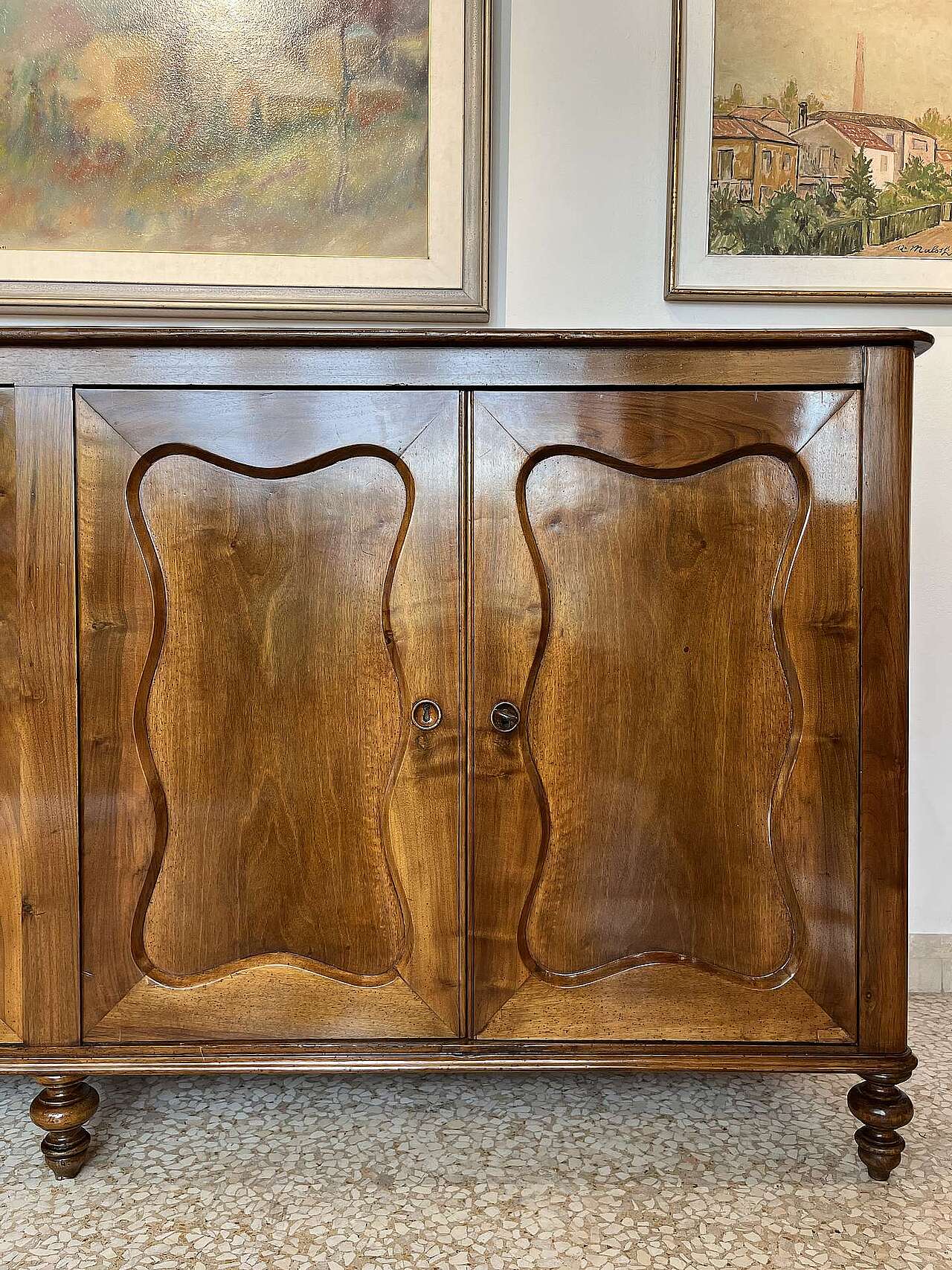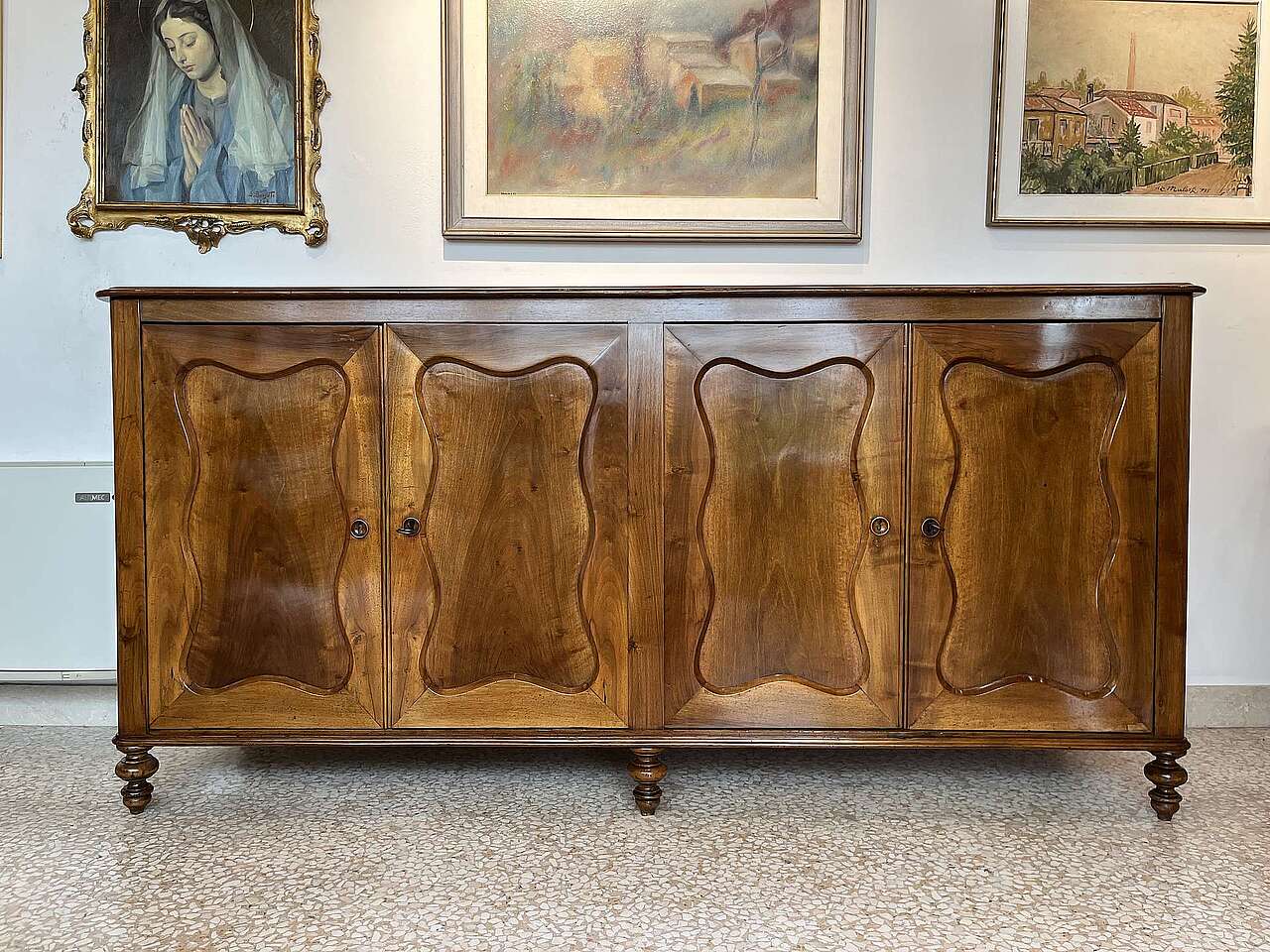 Credenza Veneta prima meta dell'800 in noce con 4 porte e 2 cassetti all'interno. Particolare del pannello delle ante sagomate tipico del periodo tra il 1830 e 40 in Veneto. Dimensioni: cm. 200 x 62 x h. 98