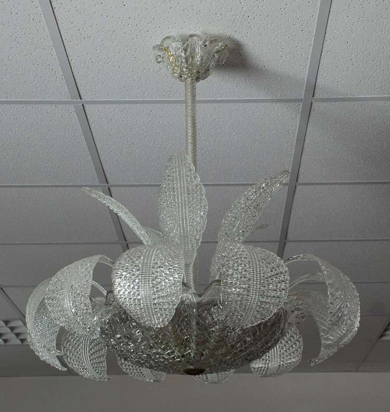 Interesting single-shaft chandelier with large leaves as decoration elements and interior light, all in white glass.