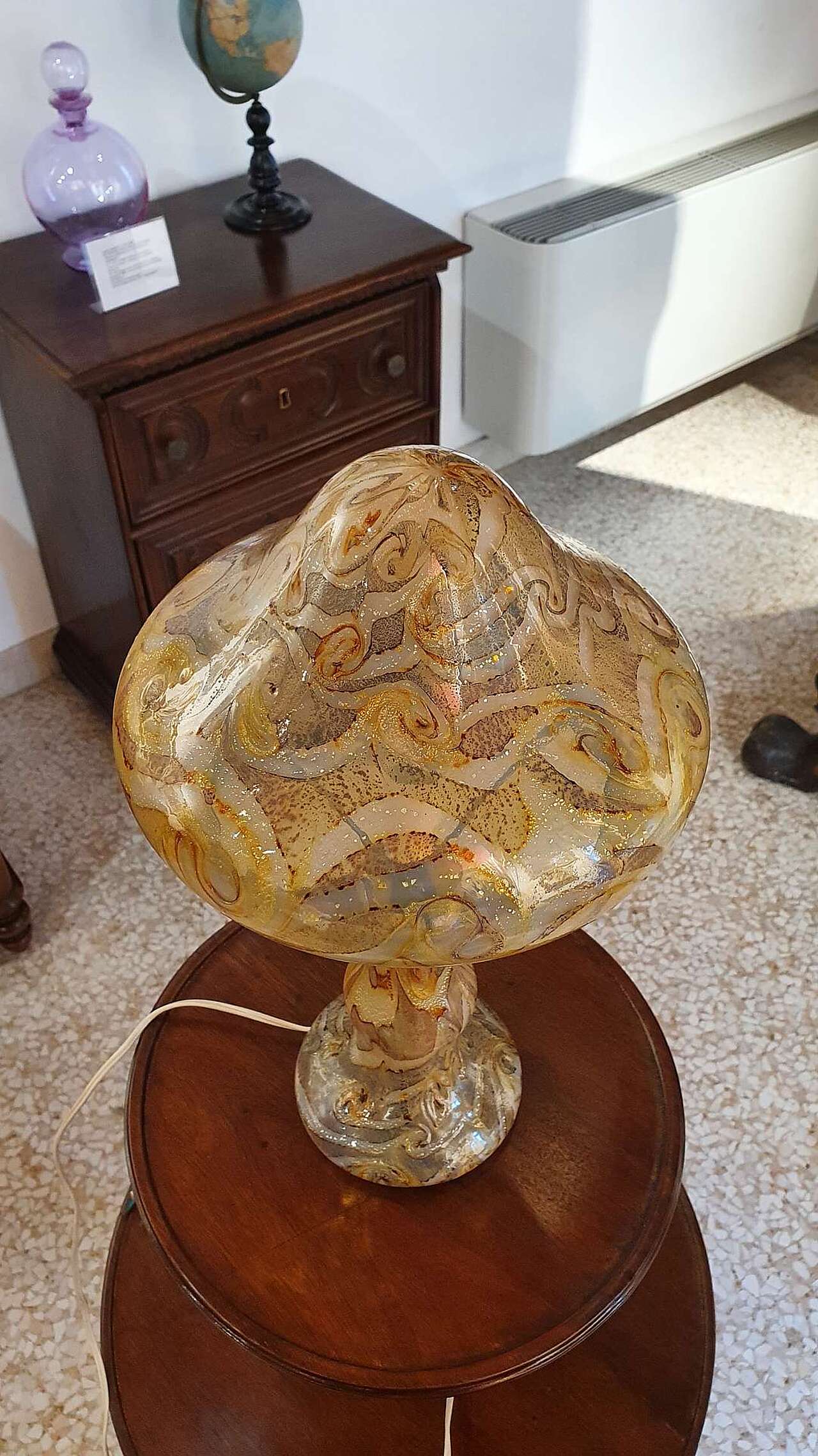 "Millefiori" lamp, height 48 cm, lampshade diameter 30 cm, made by the Toso brothers (Murano) in the 1950s / 1960s. Mushroom-shaped lampshade and balustrade-shaped base, with metal, gold glass and murrine finishes, functioning.