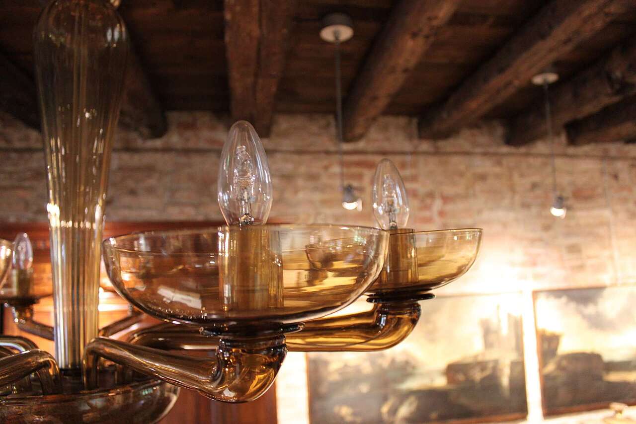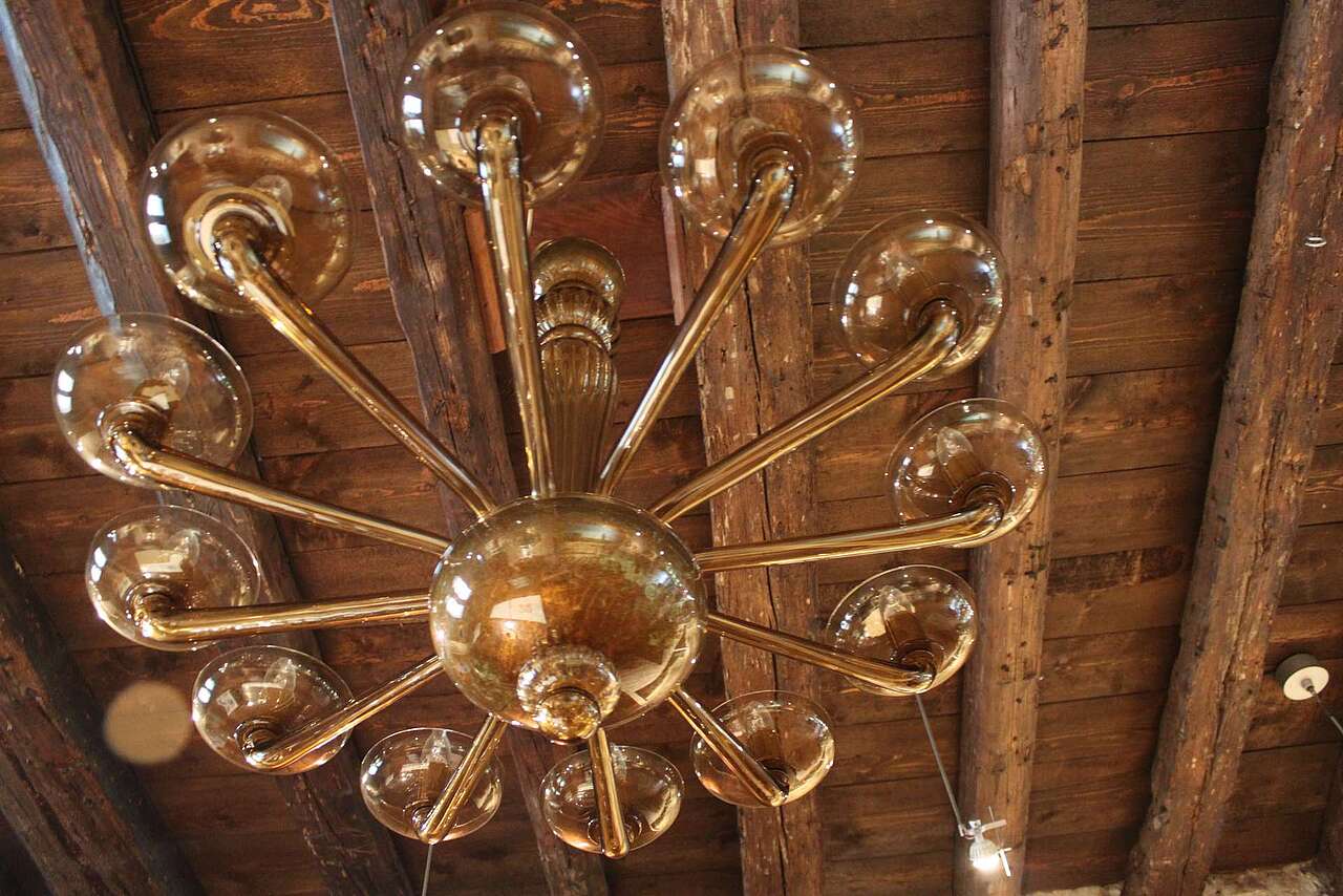 Lamp with 12 lights, amber color, ribbed glass alternating with smooth glass.