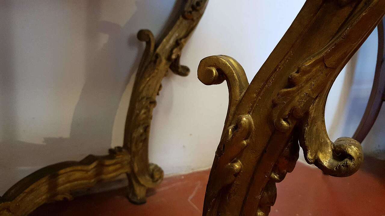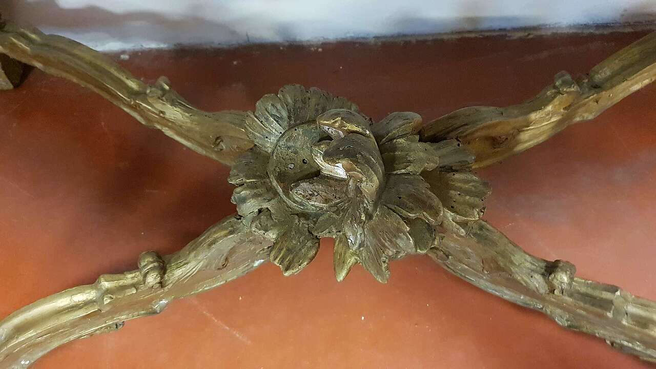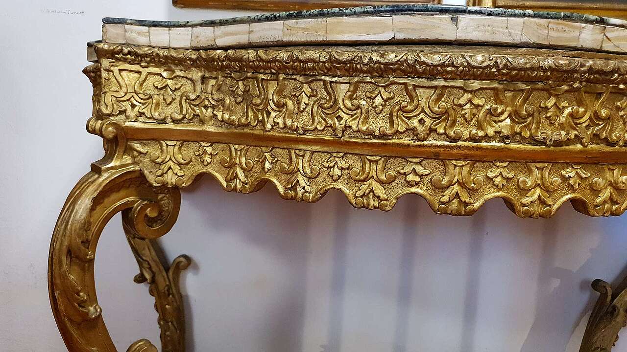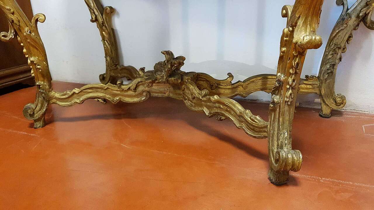Venetian console, first part of the 18th century. Entirely carved and gilded with a marble lid.