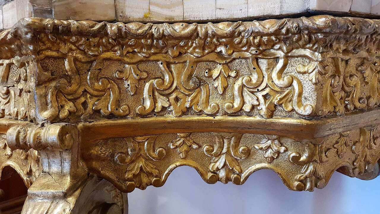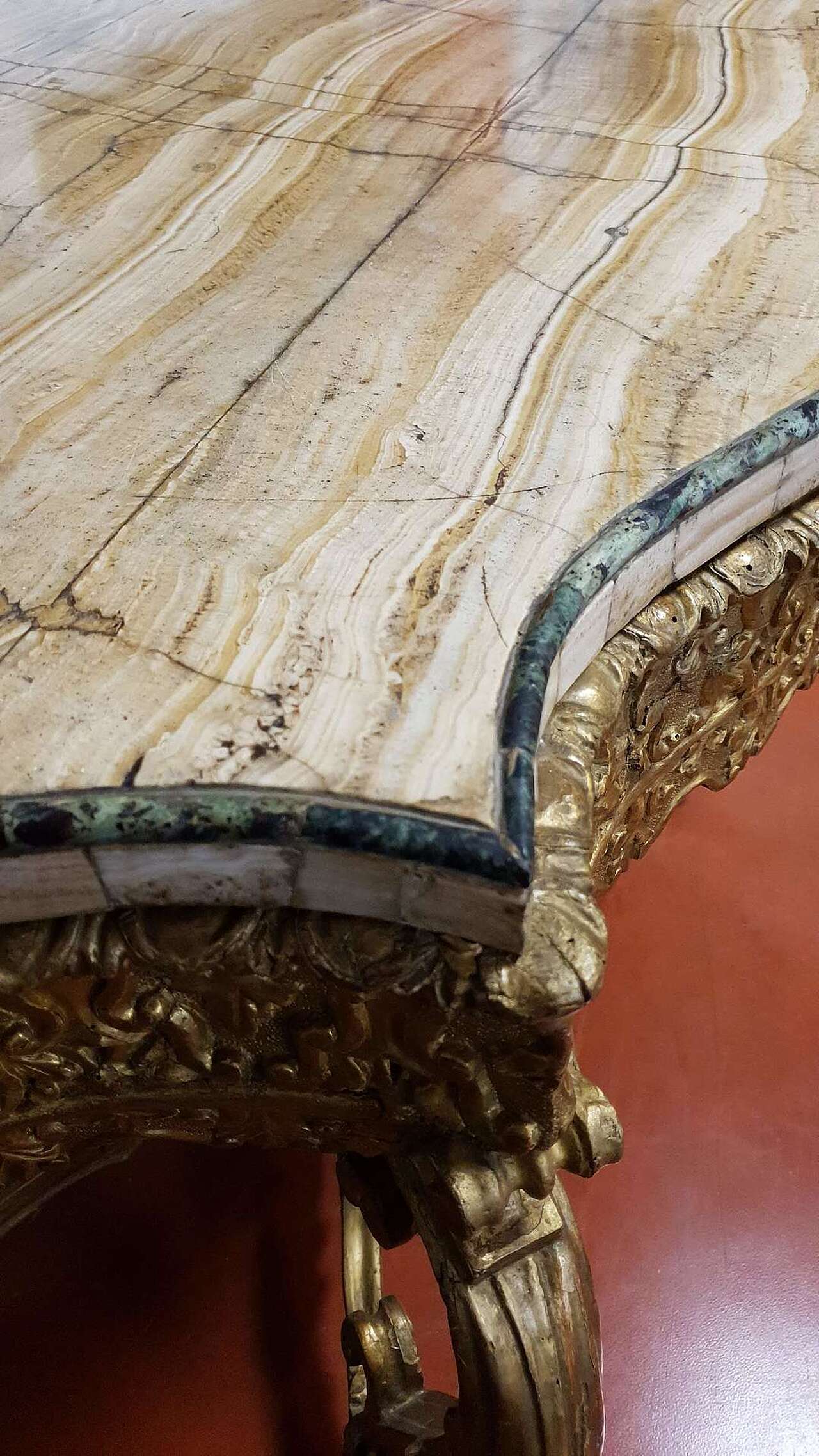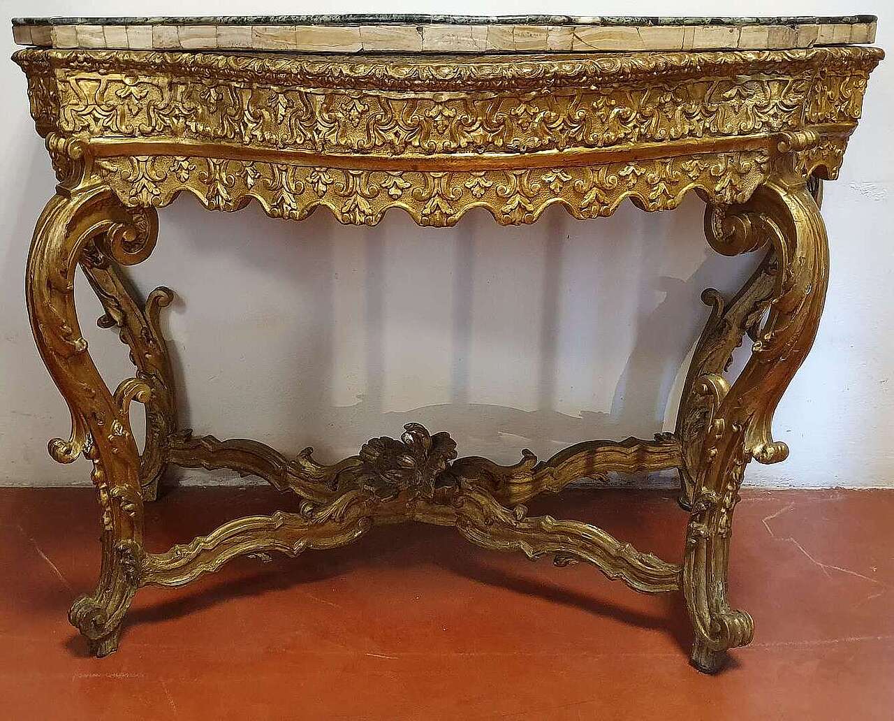 Venetian console, first part of the 18th century. Entirely carved and gilded with a marble lid.