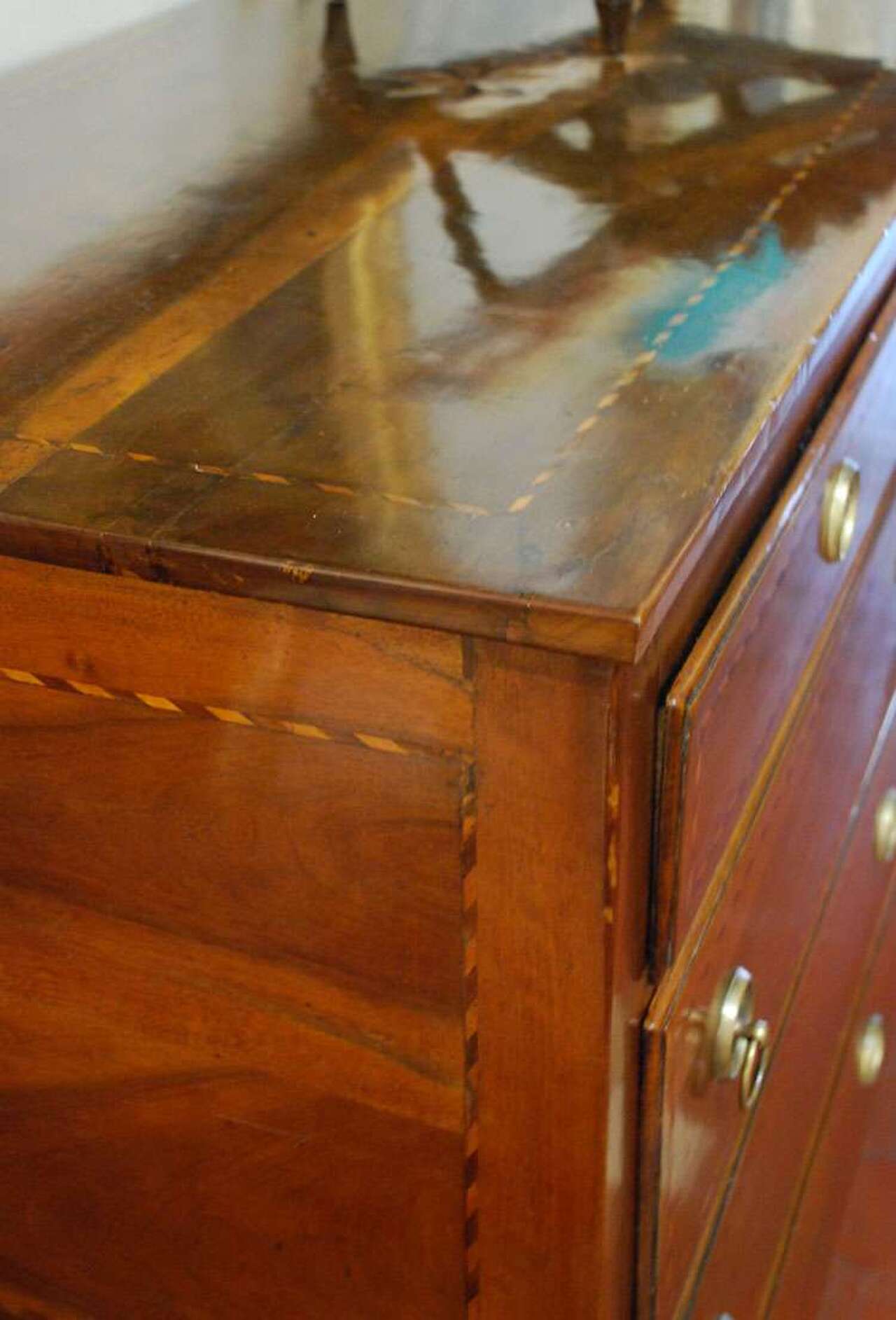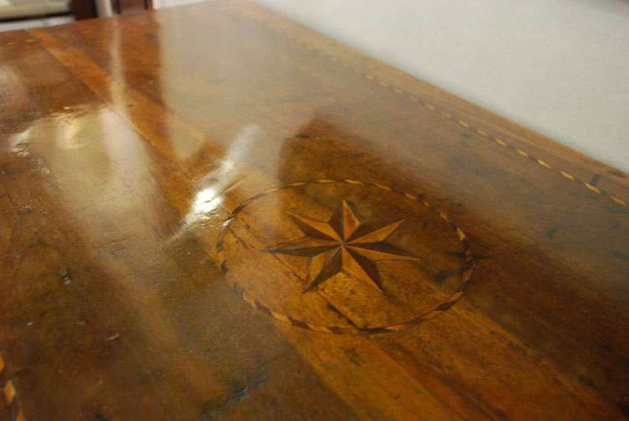 Friulian chest of drawers with three large and two small drawers, made of walnut wood, embellished in all its structure, including the lid with a beautiful thread broken up into various wood essences.