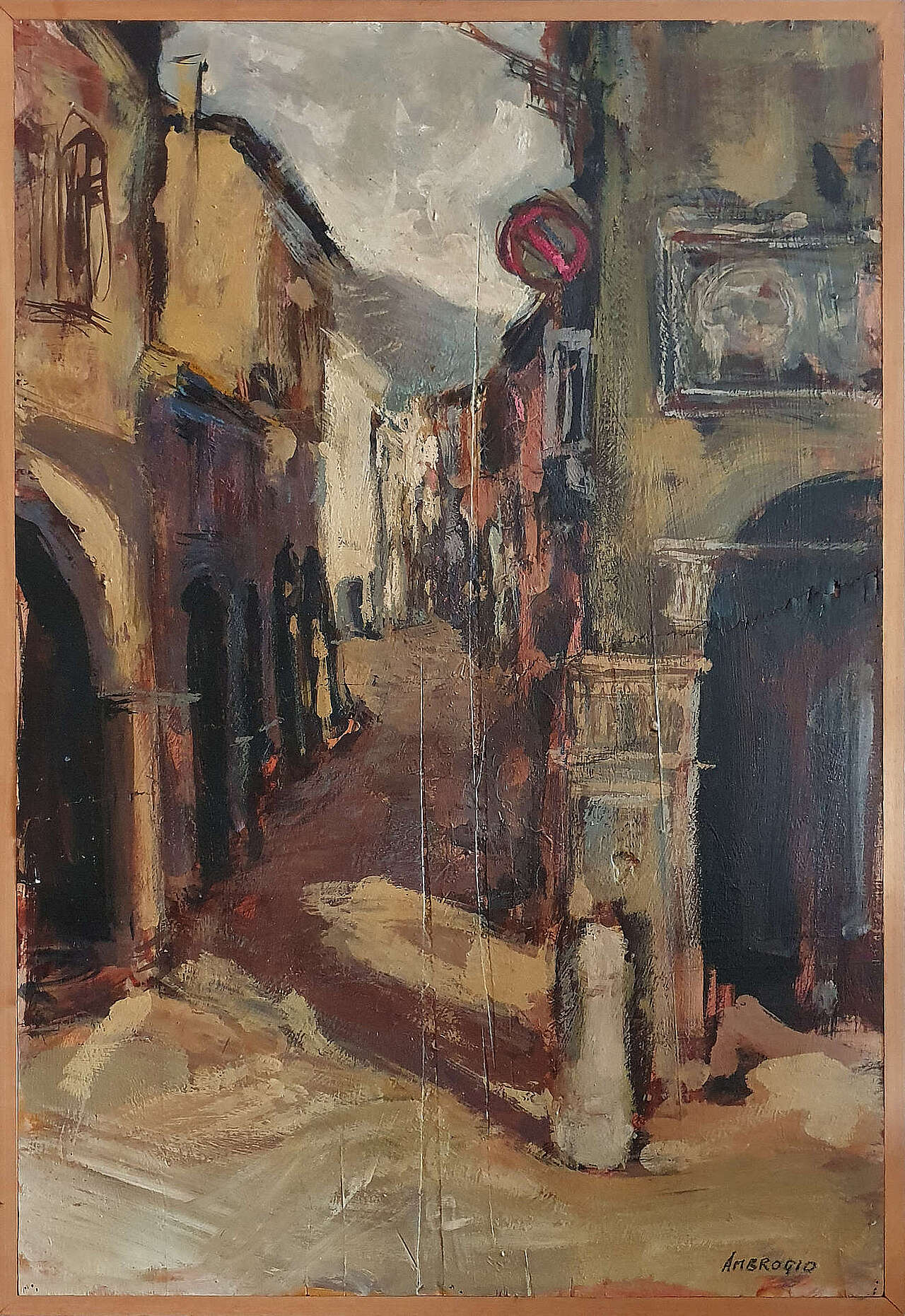 Gianni Ambrogio (Treviso 1928-Villorba (TV) 2016) Oil on canvas "Via Martiri delle Libertà - Vittorio Veneto" exposed at the exhibition