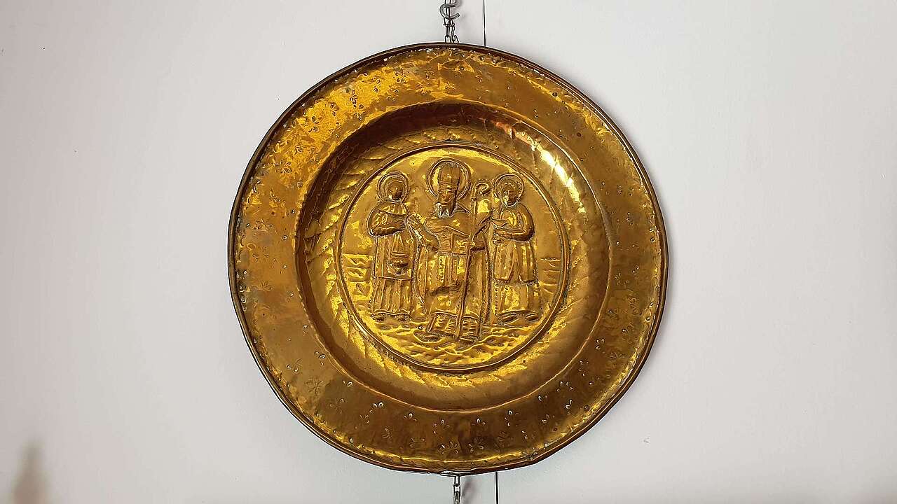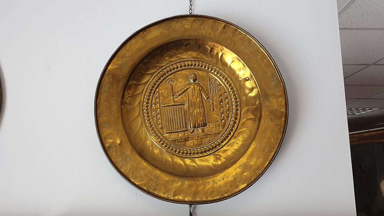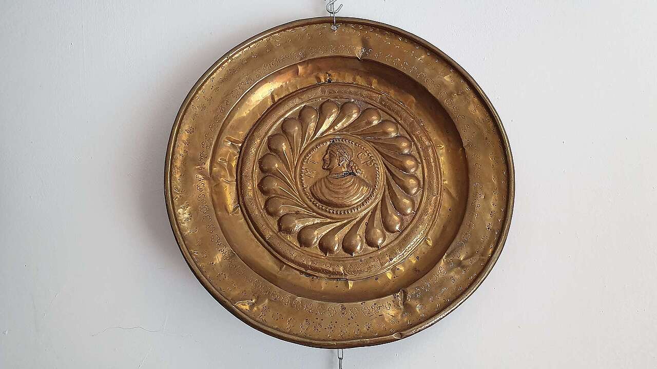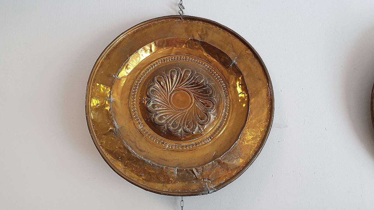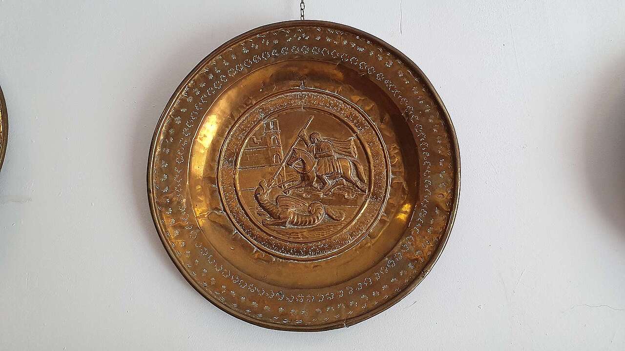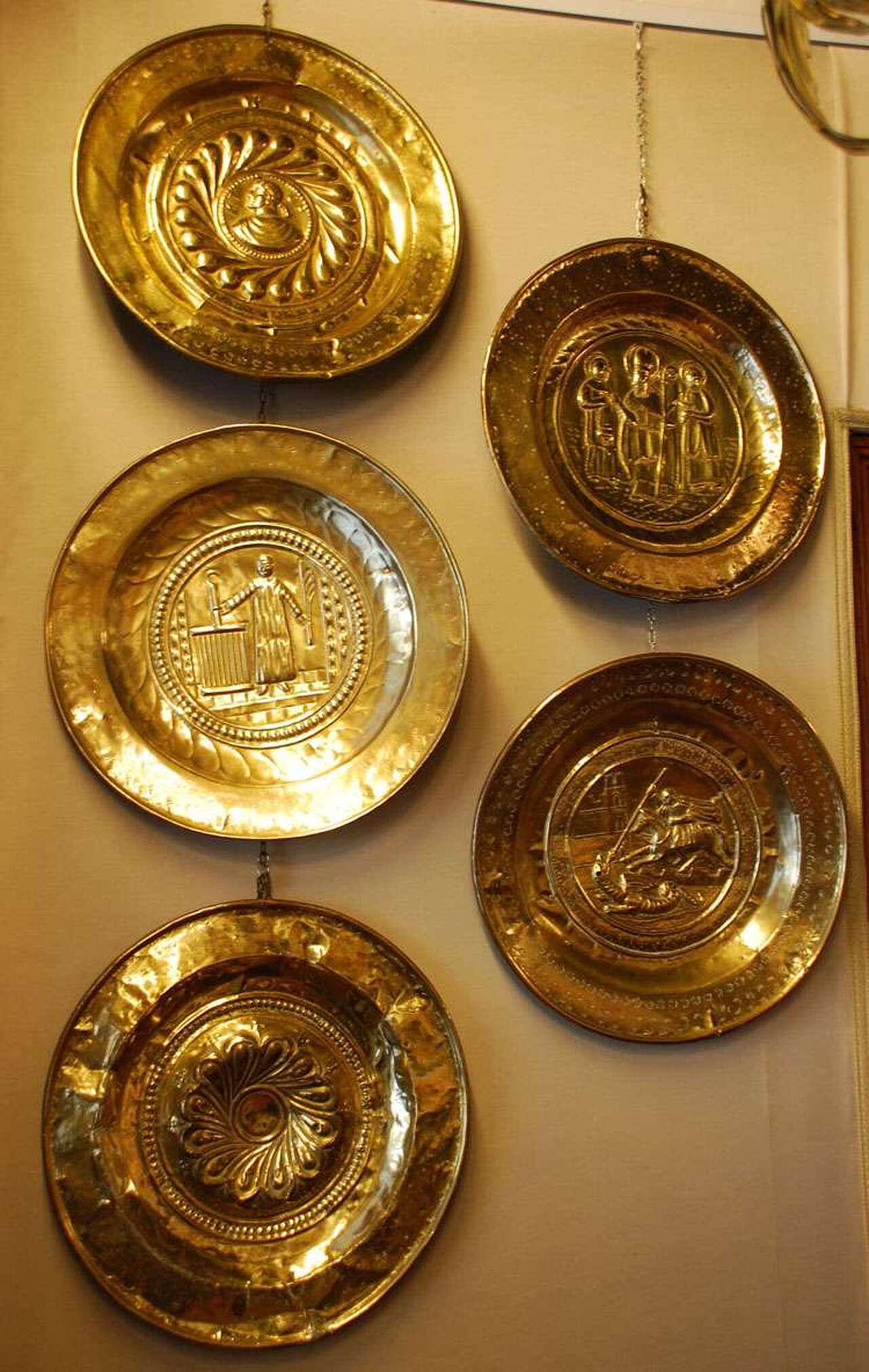 Collezione di 10 piatti di ottone o rame "porta frittelle" ("da frittoea") con varie decorazioni: S. Giorgio e il drago, S. Nicola, S. Prosdocimo...