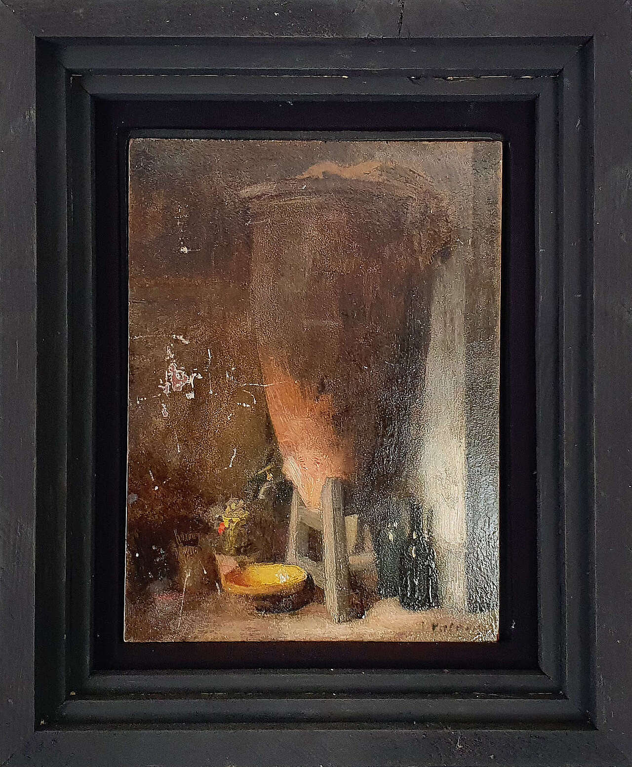 Dipinto olio su tavoletta. Pittore francese, epoca 1850, "Natura morta".