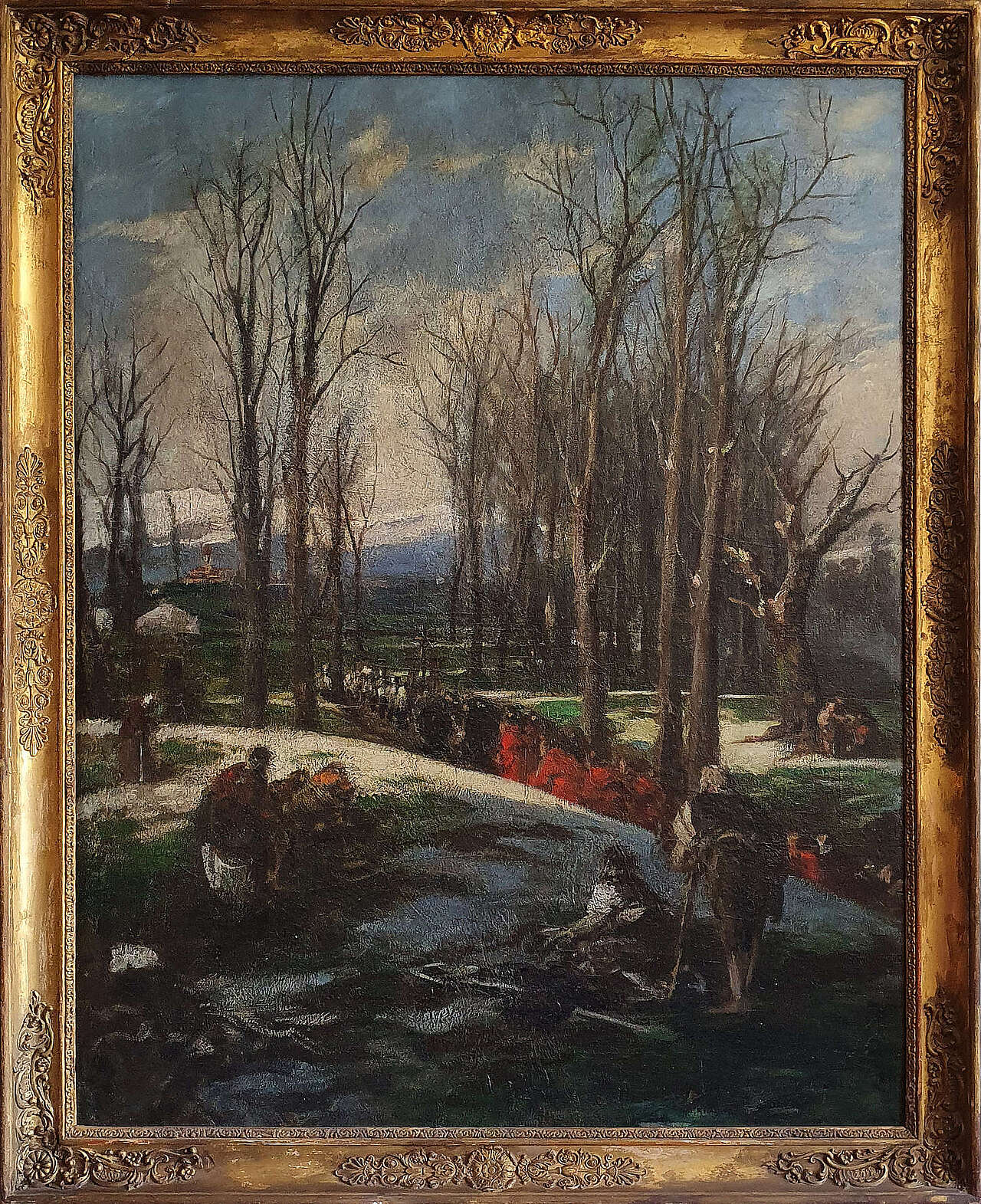 Dipinto olio su tela. Francesco Filippini (Brescia 1853-Milano 1895) Pittore del tardo impressionismo italiano. "Il corteo" Appartenuto alla collezione Fumagalli (nota famiglia milanese).