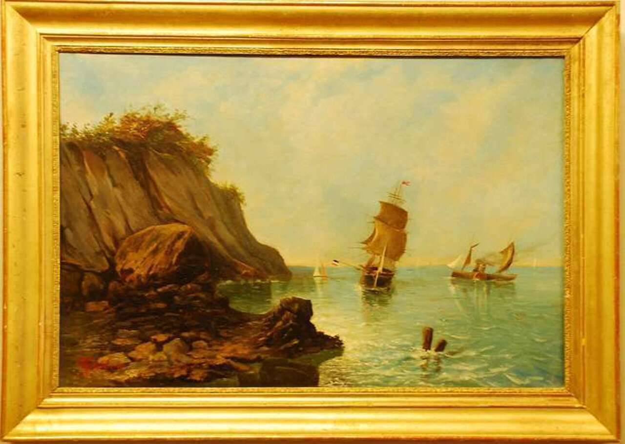 Olio su tela, "Marina", firmato Herminie Gudin, pittrice francese (1825 - 1876).