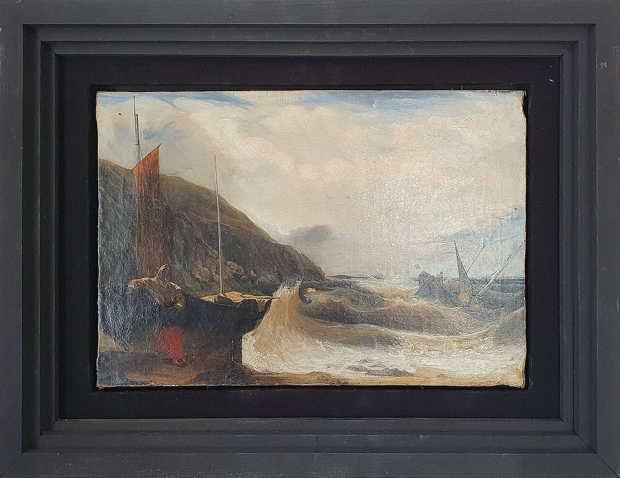 Paesaggio marino romantico. Pittore francese, epoca 1830 circa, "Bretagna". Olio su tela.