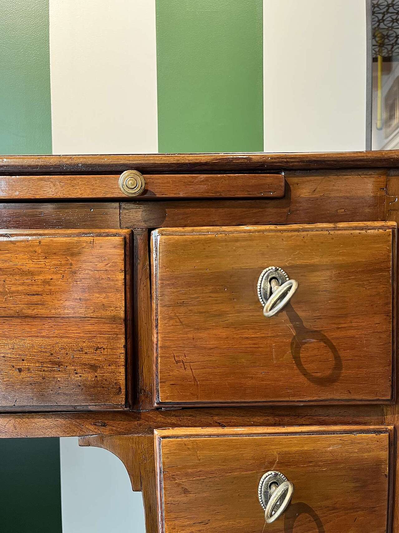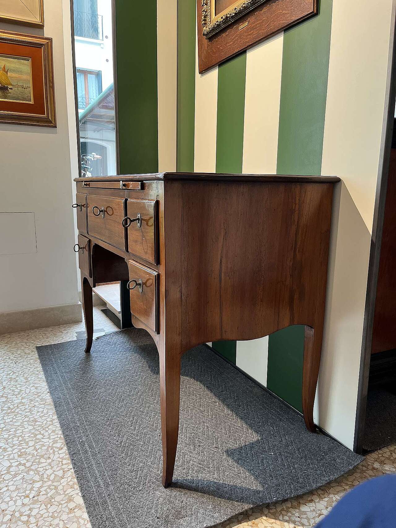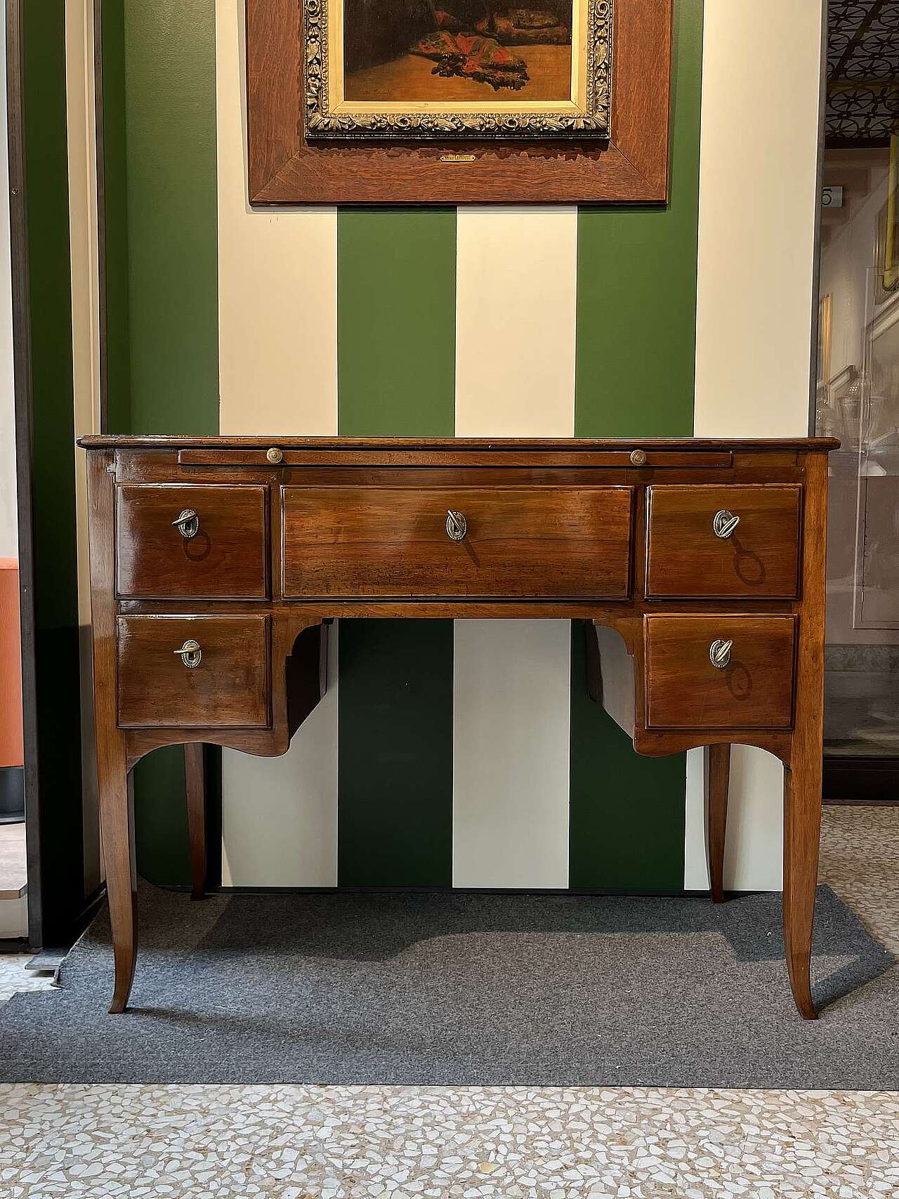 Scrittoio Veneto inizio 800 in legno di noce, di piccole dimensioni, sul fronte 5 cassetti e un tiretto. Misure 96 cm x 50 cm x altezza 75 cm