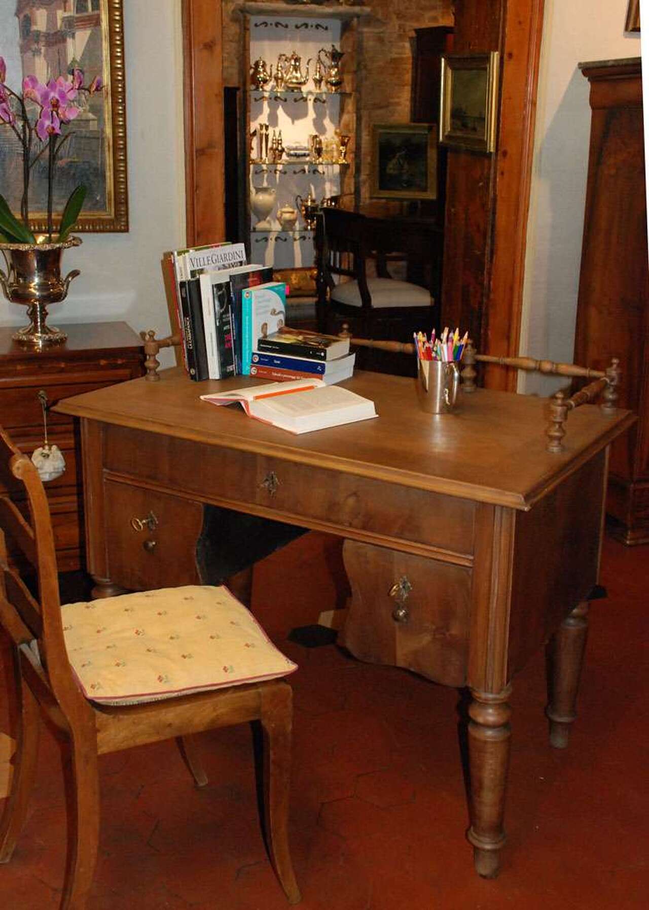 Più ordini di cassetti sono presenti sul fronte del mobile, e le gambe tornite caratterizzano il mobile stesso.