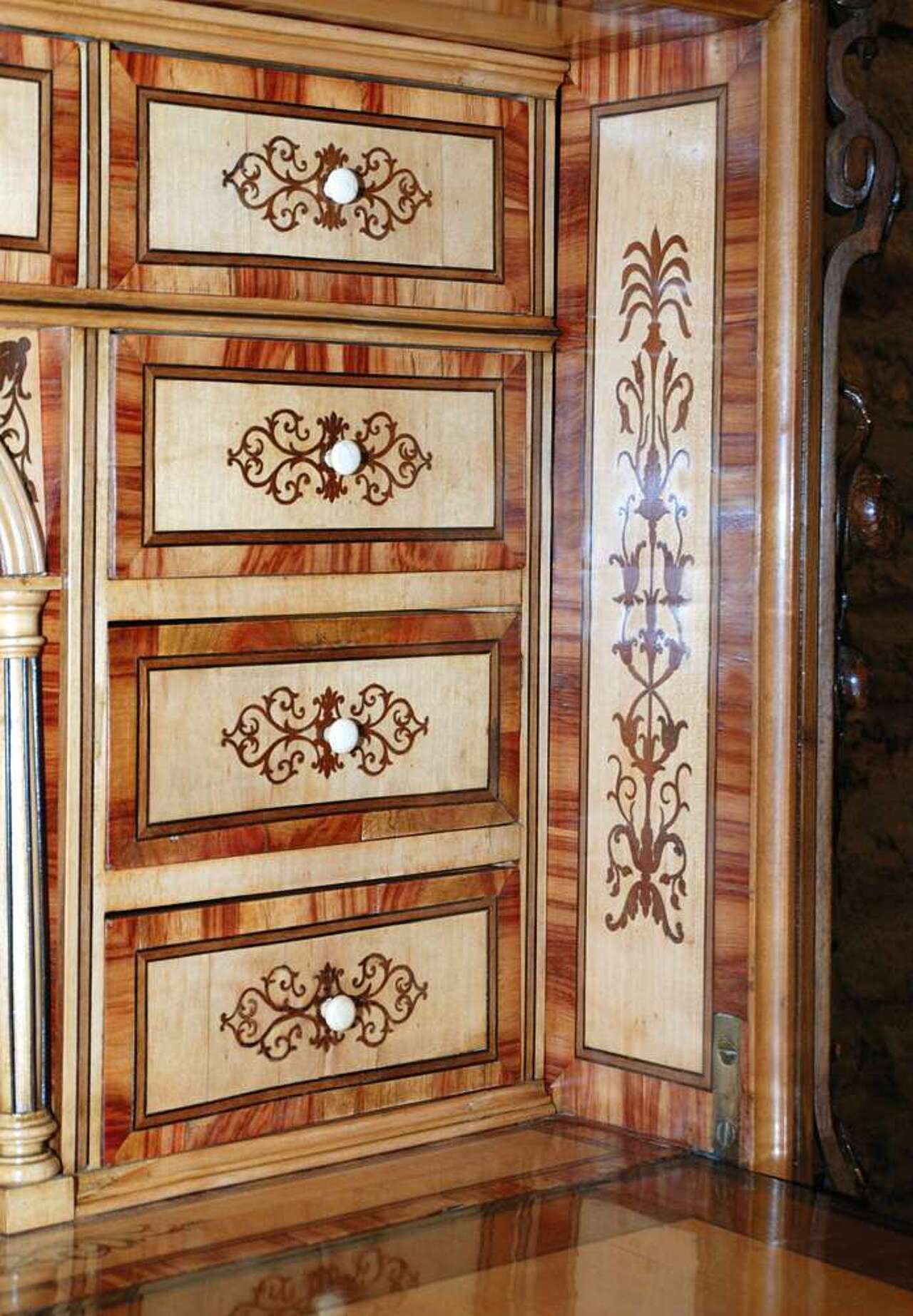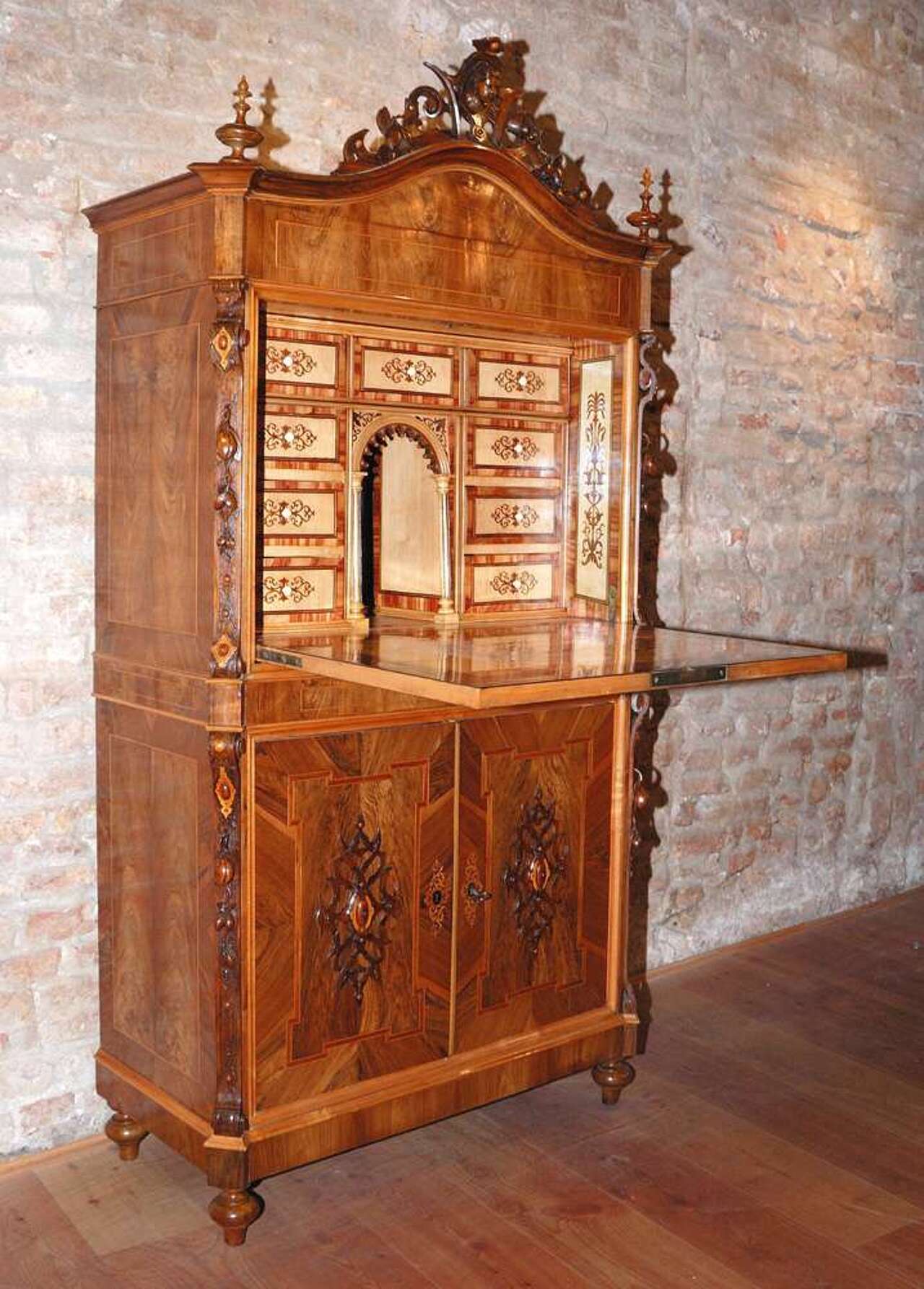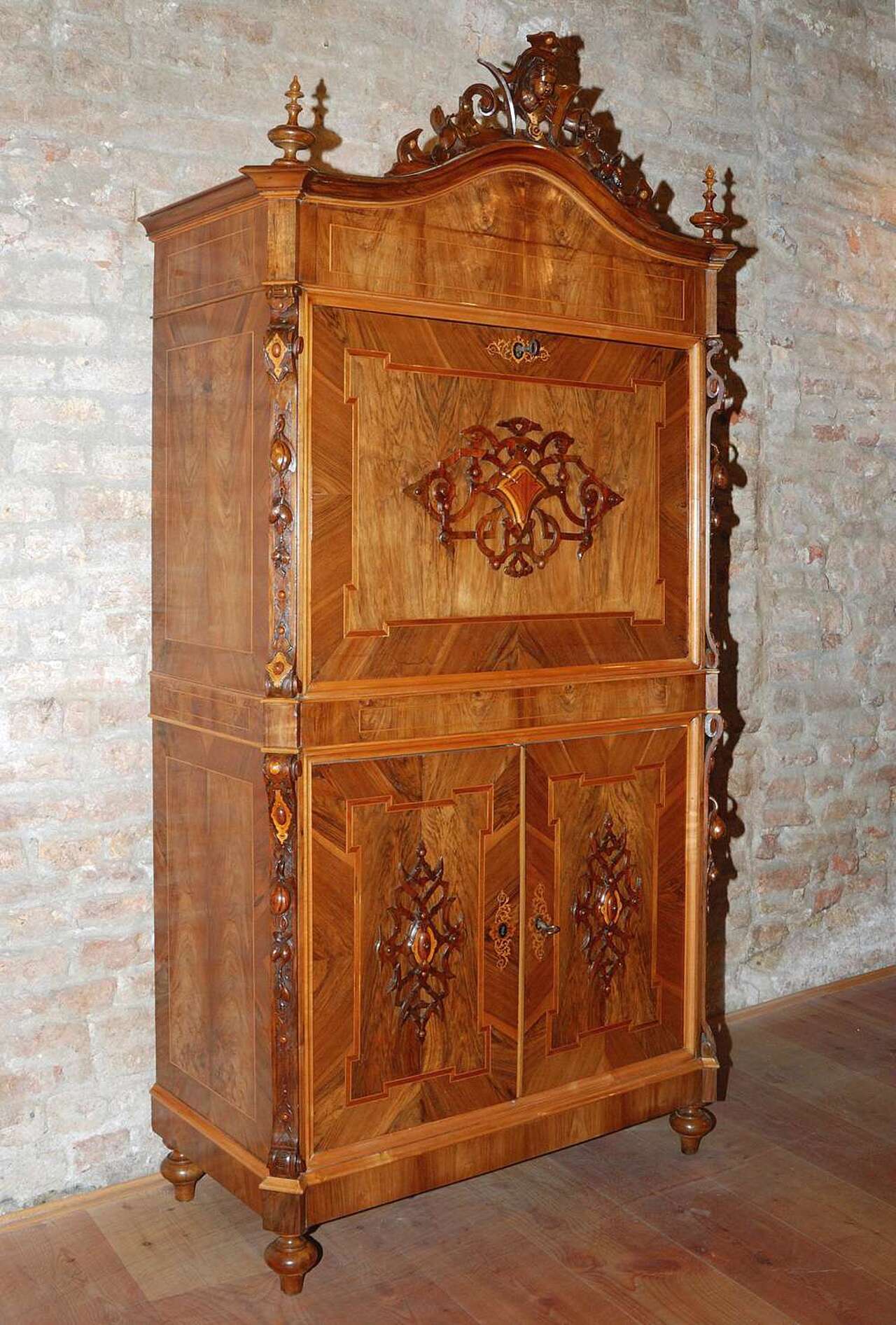 Secretaire impiallacciato in radica di noce, con raffinati intarsi in mogano, palissandro, acero e bois de rose, pomelli in avorio e parti finemente intagliate.