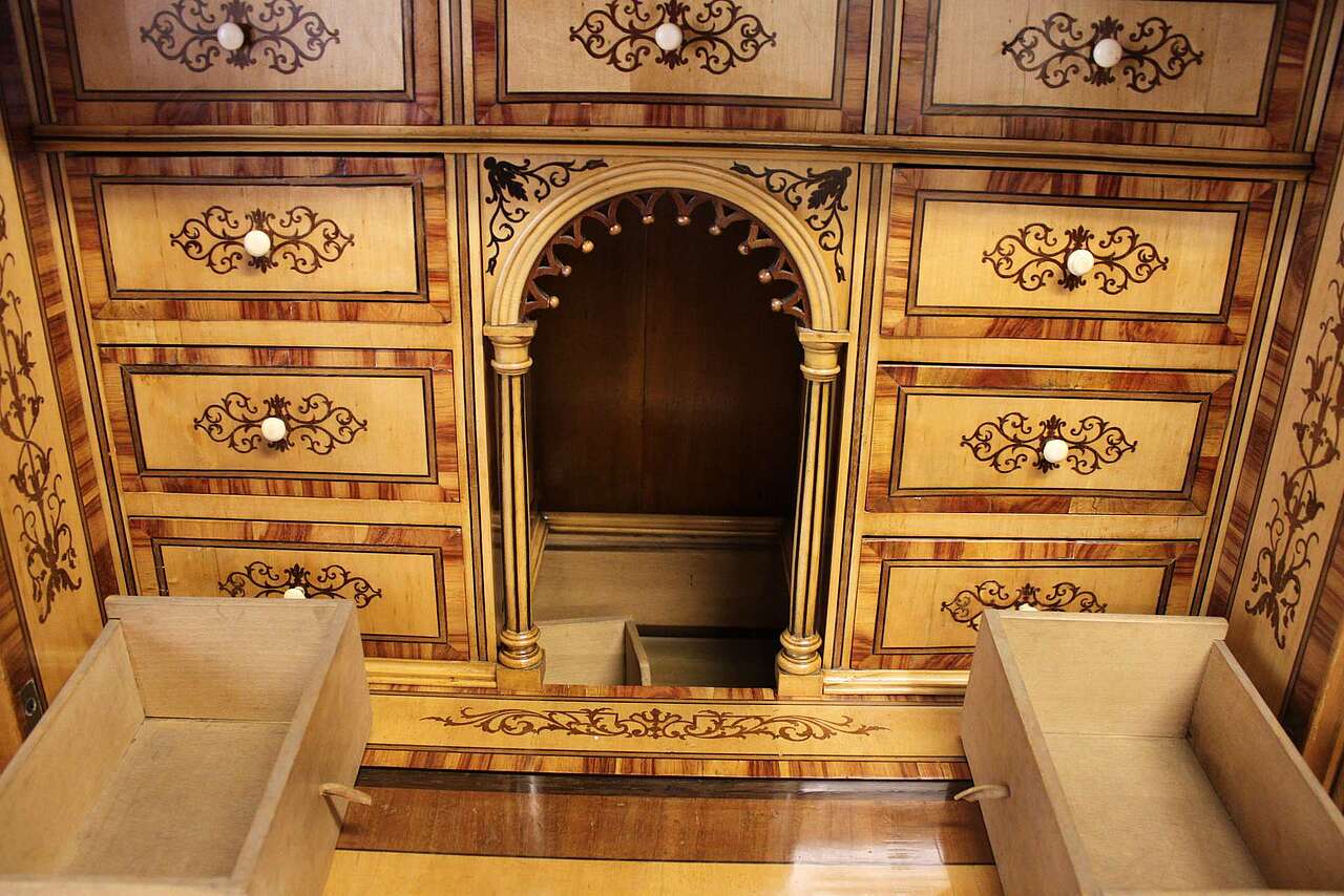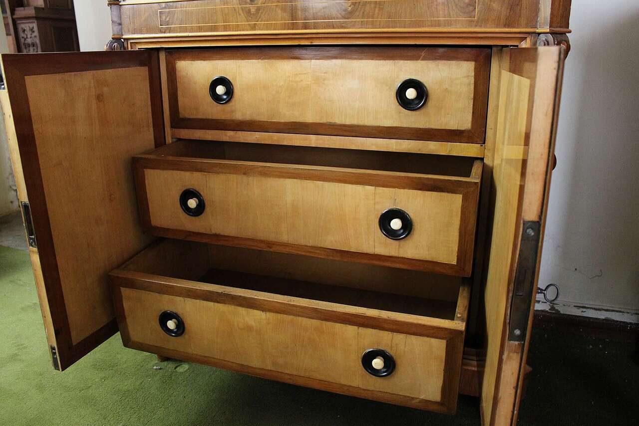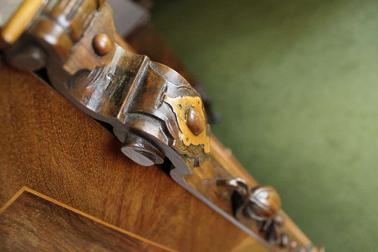 Secretaire impiallacciato in radica di noce, con raffinati intarsi in mogano, palissandro, acero e bois de rose, pomelli in avorio e parti finemente intagliate.