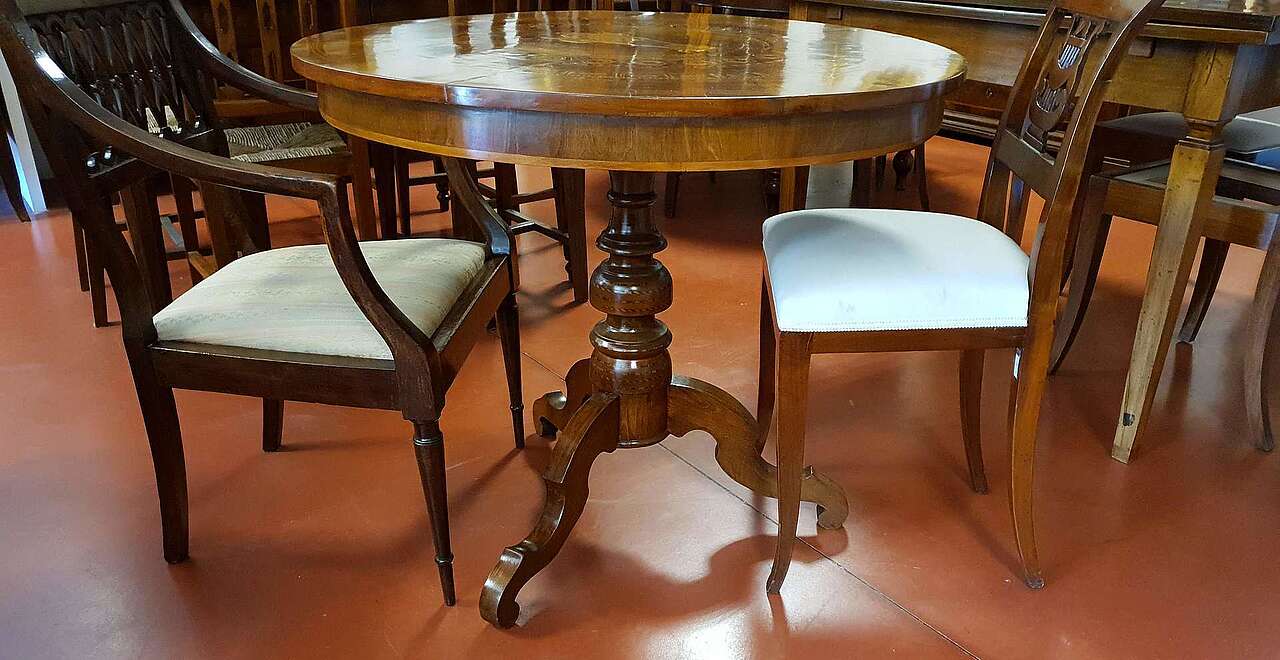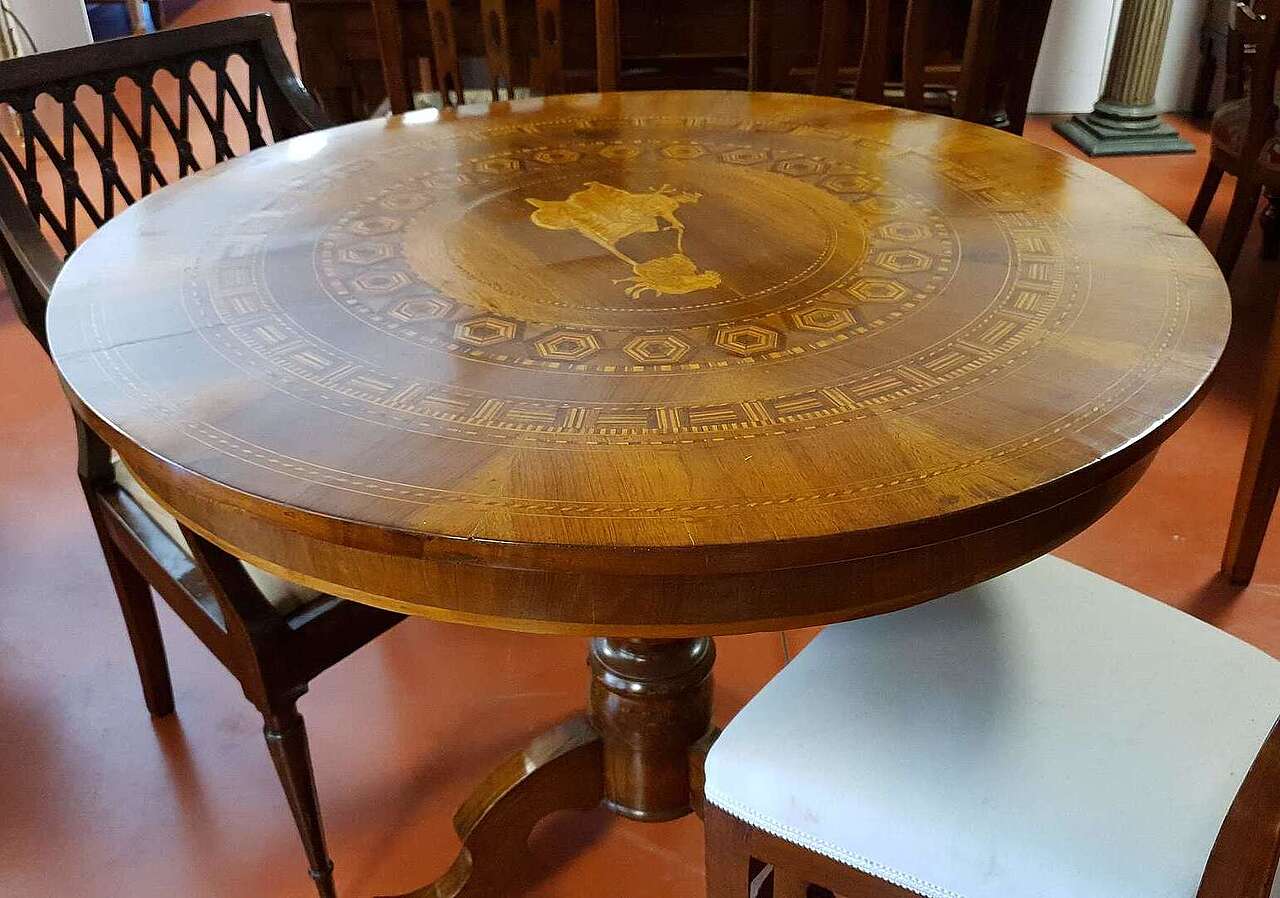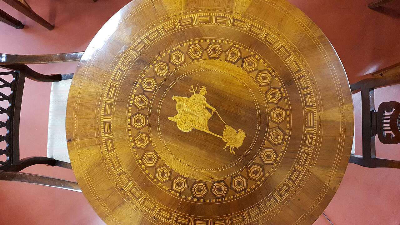 Tavolino rotondo filettato in varie esssenze pregiate con piano che presenta un decoro particolare: la biga traianata dalle oche, tipico decoro dei tavoli sorrentini della prima metà dell'800.