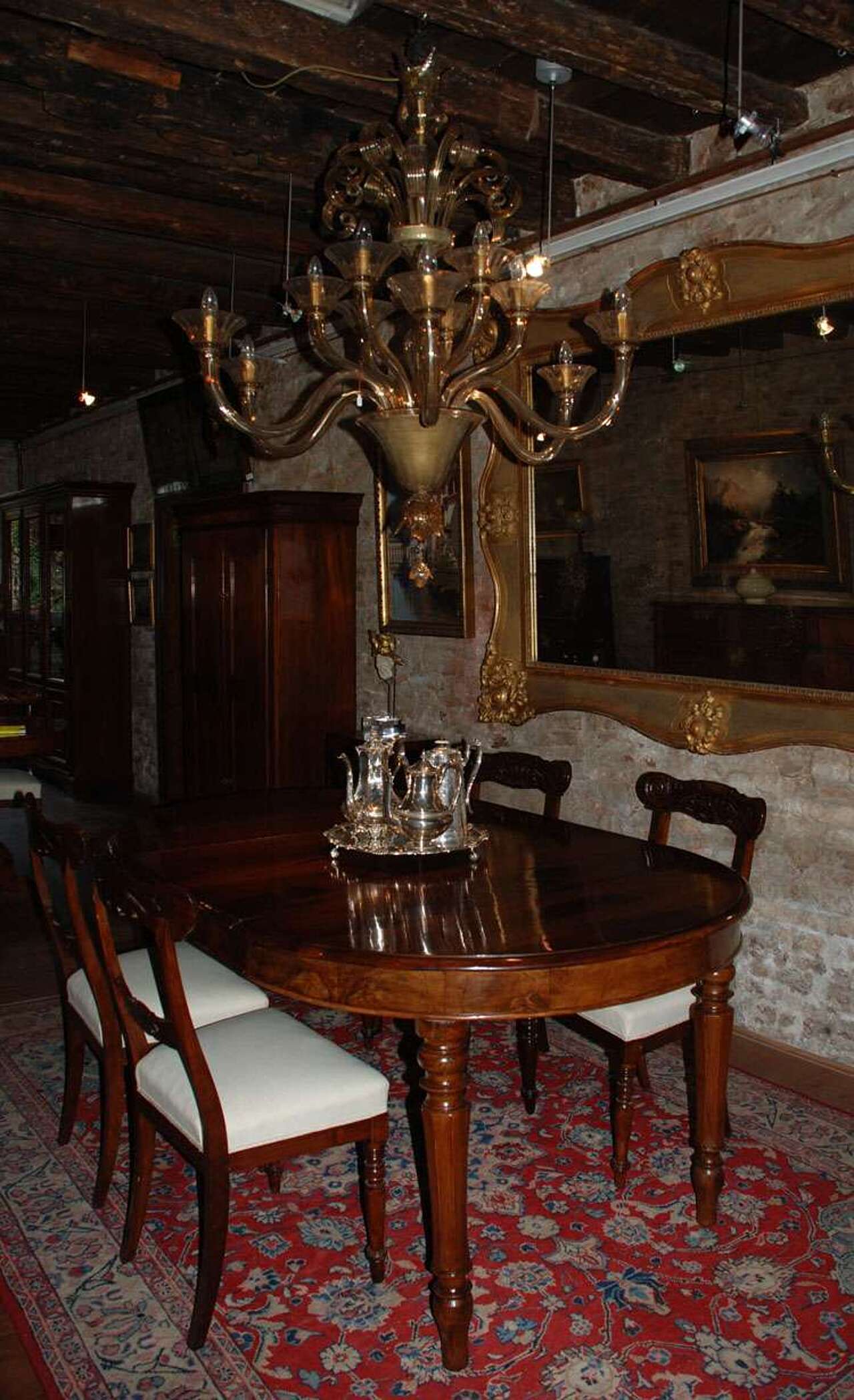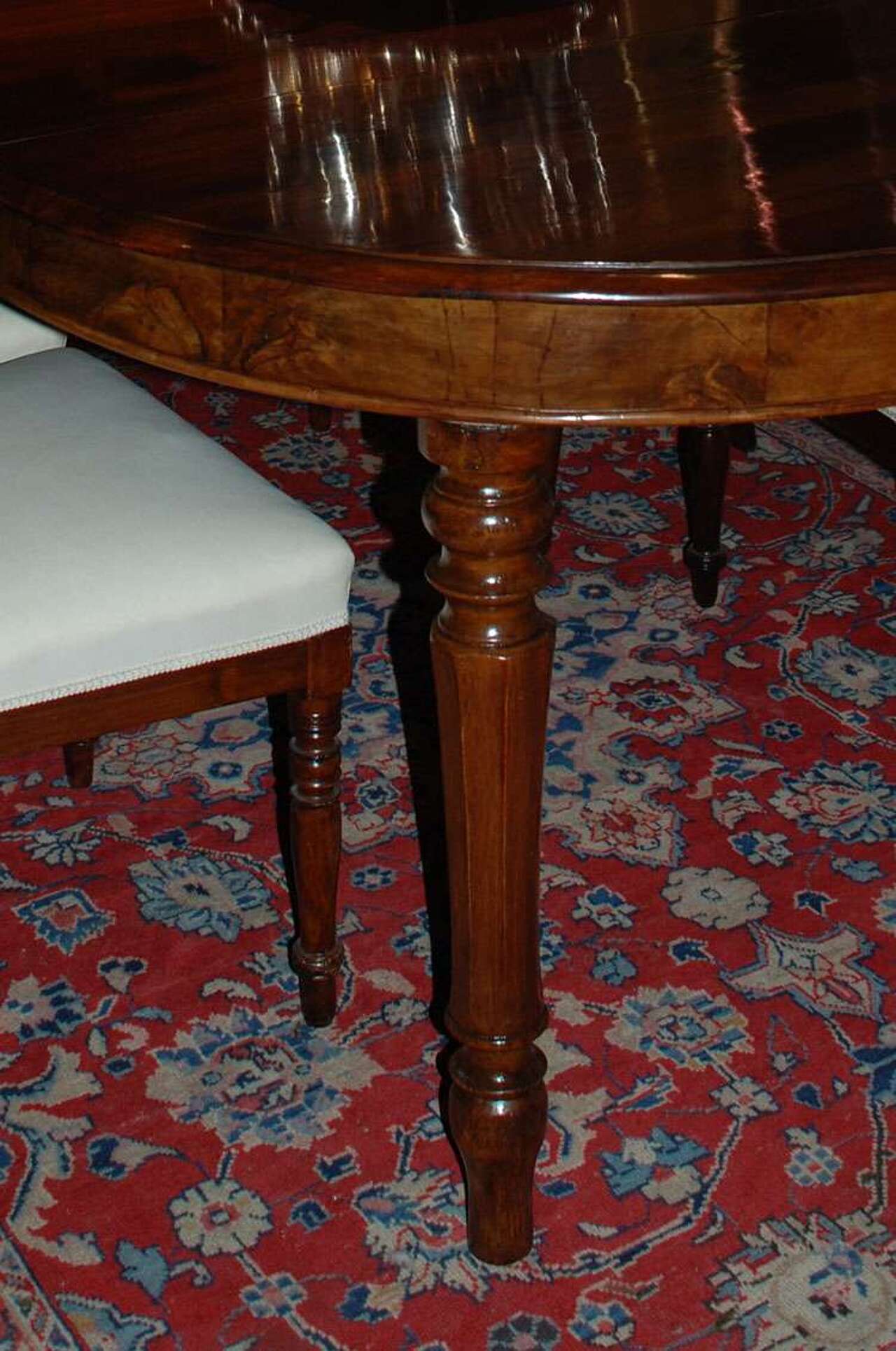 Tavolo rotondo allungabile con prima prolunga originale, tutto in legno di noce con parti lastronate in radica di noce, quattro gambe tornite e sfacettate.